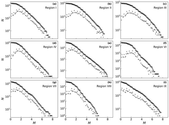 Frequency–magnitude distributions (FMDs). FMDs for the nine sub-regions of mainland China from 1970 to 2024. Open black squares represent the cumulative number of events, while gray triangles show the non-cumulative, binned frequency. The y-axis is on a logarithmic scale, and the x-axis represents magnitude. Subplots (a–i) show the results for seismic Regions I–IX, respectively, as defined in Figure 6 and listed in Table 2.
