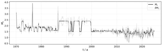 The choice of calculation method is critical to b-value accuracy. While the traditional least-squares method is straightforward, it can introduce systematic bias by assigning different weights to earthquakes of different magnitudes []. In contrast, the maximum likelihood estimation (MLE) method assigns equal weight to every event in the catalog and is known to produce smaller errors, be less computationally intensive, and yield more stable results, particularly with small sample sizes [,]. Therefore, to ensure the accuracy and reliability of our b-value calculations, this study employs the MLE method. Following the classic approach proposed by Aki (1965) [], once the minimum magnitude of completeness () has been determined, the b-value is calculated using the following formula: