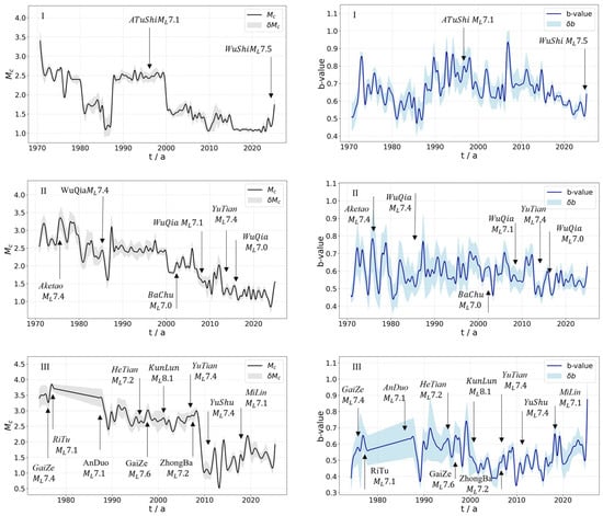 Specifically, in Region I, the remained between 2.5 and 3.0 before 1980 and exhibited some volatility. After 1980, the experienced more pronounced fluctuations but gradually stabilized at around 2.5 after 1990. After 2000, the decreased significantly and was maintained at a stable level between 1.0 and 1.5 for an extended period. However, after 2020, the rose noticeably, with this upward trend becoming more pronounced following the 7.5 Wushi earthquake in 2024. The b-value in this region generally varied between 0.5 and 1.0. In the early 1970s, it rose sharply to about 0.85 before dropping rapidly to 0.6. Despite a brief recovery, it showed a general downward trend with fluctuations until 1987. Between 1990 and 2010, the b-value remained between 0.6 and 0.8. A significant drop occurred in 2010, followed by a continued decrease until signs of recovery appeared in 2024.
