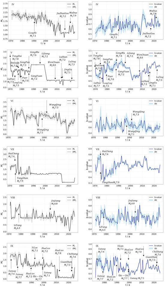 Region IX, which covers Taiwan, is affected by frequent strong earthquakes, and as a result, variations are particularly dynamic. From 1970 to 1987, the was approximately 1.0–2.0. It rose to 1.2–2.2 between 1987 and 1993, then decreased to 0.9–1.4 from 1994 to 2011. Since 2011, the has remained at a low level, stabilizing near 0.3. The b-value in this area showed large-amplitude fluctuations between approximately 0.35 and 0.7 from 1970 to 1990. From 1990 to 2000, these fluctuations diminished, and the value remained between 0.4 and 0.6. After 2000, fluctuation amplitudes increased again, reaching a maximum of 0.7.