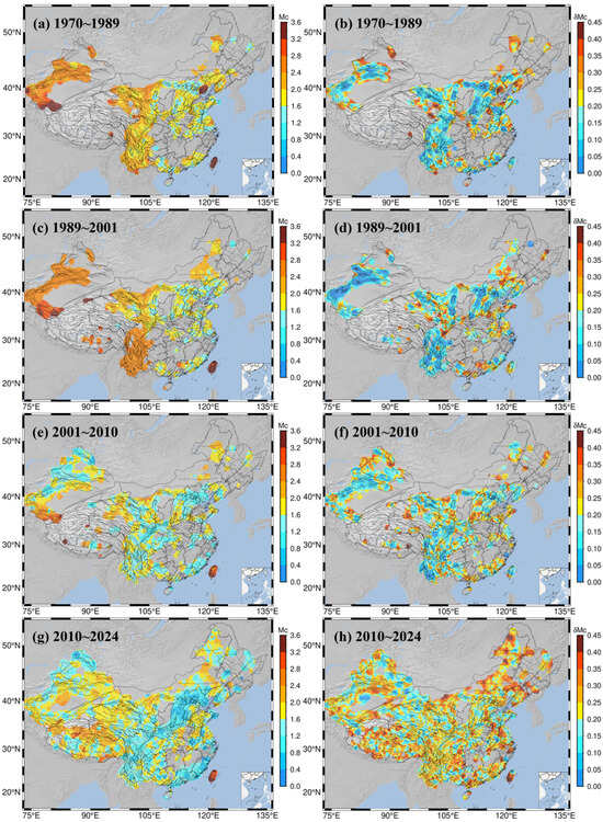 Spatial distribution of and values in the study area for different time periods. (a,c,e,g) show values for 1970~1989, 1989~2001, 2001~2010, and 2010~2024, respectively; (b,d,f,h) show values for the corresponding time periods. The color scales indicate values ranging from 0 to 3.6 and values ranging from 0 to 0.45.