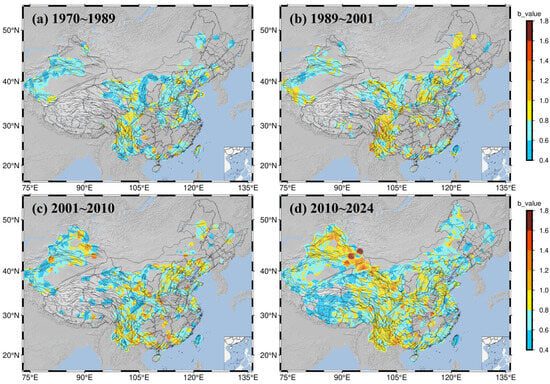The calculated spatial distributions of the for the four time periods across mainland China are shown in Figure 11, where gray-white areas indicate regions with an insufficient number of events for calculation. During the 1970–1989 period, distribution in northwestern China was primarily concentrated along the Tianshan mountain range in Xinjiang. For instance, in the Western Kunlun belt of the Tibet–Xiyu block (western section), the ranged from 2.8 to 3.6, with a between 0.1 and 0.25. Meanwhile, the in the North Tianshan belt was slightly lower than in the South Tianshan belt, at approximately 1.6~2.4, with a not exceeding 0.1. The Haiyuan–Qilian belt, located in the Tibet–Xiyu block (eastern section), exhibited values between 2.0 and 3.2. In central mainland China, the was concentrated around the Ordos block in parts of Gansu and Ningxia, as well as in the Beijing–Tianjin–Tangshan area, Shanxi, and surrounding regions of North China. West of the Ordos block, the Helan Shan belt (part of the North China–Xiyu block) had an of 0.5~1.8. To the north, the Yinshan belt (part of the North China–Northeast Asia block, western section) showed an of 0.5~1.2, with a of 0.05~0.25. To the south, the Qinling–Dabie Shan belt (part of the North China-South China block, eastern section) had an between 1.5 and 2.4. To the east, the Fen–Wei belt (part of the Ordos-North China Plain block) had an of 0.6–1.6, with a below 0.1. East of the Fen–Wei belt are the Anyang–Heze–Linyi and Hebei Plain belts, where the ranged from 0.6 to 2.5, averaging around 1.5. The adjacent Yanshan–Bohai belt to the northeast (part of the North China–Northeast Asia block, eastern section) showed a high of 2.8~3.4 and a of 0.35~0.4. In the southwest, the Minshan–Longmen Shan belt (northern section of the Tibet–South China block) and the Anninghe–Xiaojiang belt (southern section) had an between 1.6 and 2.6. The Red River belt had an of 2.0~3.2, while the Lancangjiang fault zone in the West Yunnan–South Yunnan block showed an of 2.0~3.4. Additionally, in the southeastern coastal regions of Fujian and Guangdong, influenced by seismic activity in Taiwan, the was between 1.1 and 2.4. Taiwan itself exhibited an above 3.6. In contrast, large parts of the northeast and the middle and lower reaches of the Yangtze River plain, central and eastern Inner Mongolia Plateau, and most of South China were predominantly gray areas.