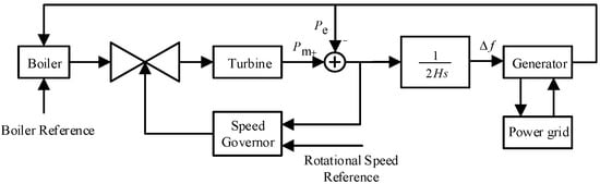 The frequency response characteristics of conventional thermal power units are primarily determined by the swing equation of synchronous generators and the dynamic characteristics of their governor systems []. Following a power disturbance after a system fault, the swing equation of the synchronous generator is described by