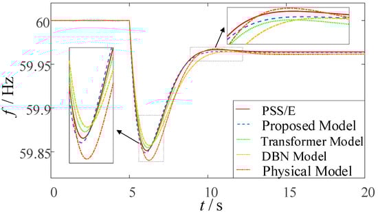 As observed in Figure 12, the proposed method consistently demonstrates superior comprehensive performance across all four core evaluation metrics when benchmarked against PSS/E time-domain simulation results. The simultaneous significant reductions in both MAE and RMSE substantiate enhanced prediction accuracy from two perspectives: measuring average absolute deviation and penalizing large errors. Particularly, the minimized DTW distance indicates that the frequency curve predicted by our method exhibits the closest dynamic morphology to the actual curve, accurately capturing the temporal characteristics of the transient process. Although the absolute improvement in R2 appears modest, its value being closest to unity reflects the model’s optimal goodness-of-fit in representing the overall variation trend of frequency response, revealing its exceptional capability in capturing underlying physical mechanisms. These metrics collectively validate the comprehensive superiority of our fusion approach through multiple complementary dimensions, including error magnitude, curve morphology, and trend fitting.