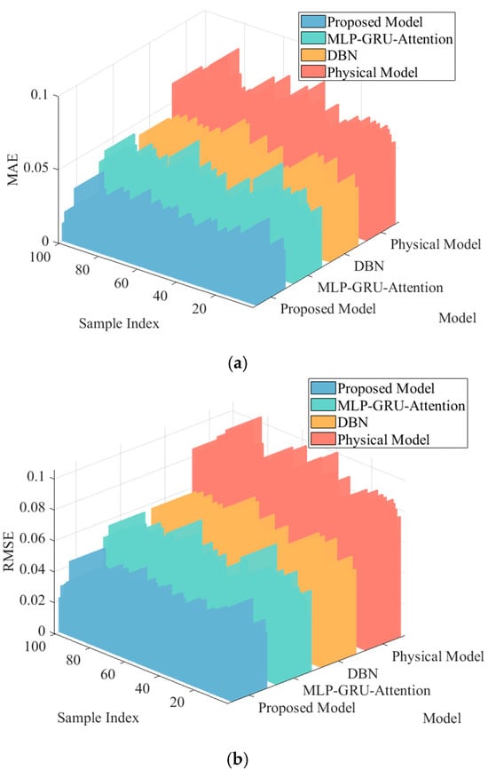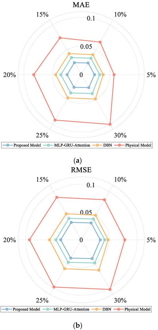 As shown in Figure 14, the proposed method demonstrates the most gradual increase in all evaluation metrics under progressively increasing noise levels. The slow growth of both MAE and RMSE quantitatively confirms the method’s insensitivity to measurement noise in terms of absolute error and prediction volatility, indicating excellent robustness. In contrast, traditional physics-based methods exhibit significantly rising evaluation metrics with increasing noise, primarily because their equivalent parameters are directly calculated from noisy data without establishing noise compensation mechanisms. The strong noise resistance of our method can be attributed to two key aspects: first, the data-driven module inherently possesses certain noise-smoothing capabilities; second, and more importantly, the embedded physics-guided framework enhances the contribution of key physical features through information entropy weighting and constrains prediction trajectories via physical consistency loss. This essentially enables adaptive noise filtering and trajectory calibration, thereby significantly improving reliability in challenging measurement environments.