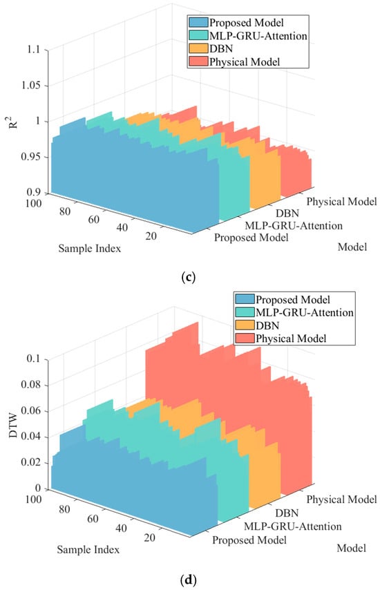 To thoroughly validate the generalizability of the conclusions drawn from the aforementioned case analysis, the proposed fusion model, the standalone MLP-GRU-Attention model, and the DBN model were trained using the training dataset. Subsequently, 100 test samples were randomly selected from the original test set to evaluate the performance of each model in predicting post-disturbance transient frequency, with the computational results from the physical model also included for comparison. All predictive performance assessments were benchmarked against the PSS/E time-domain simulation results described in Section 5.1. Based on this benchmark, the average values of four metrics—RMSE, MAE, R2, and DTW—across all samples were calculated. The comprehensive predictive performance comparison of the four methods is ultimately presented in Figure 12.