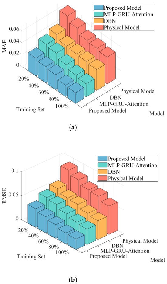 In order to verify the generalization ability of the data-model fusion method proposed in this paper, 20%, 40%, 60%, 80%, and 100% of the total training samples are randomly selected as five new training sample sets, and the models of this paper’s method, MLP-GRU-Attention model prediction method, DBN model prediction method, and the physical model method are constructed for the comparative analysis of the prediction effect under the five training sets. The final comparison of the prediction effect of the four methods is shown in Figure 13.