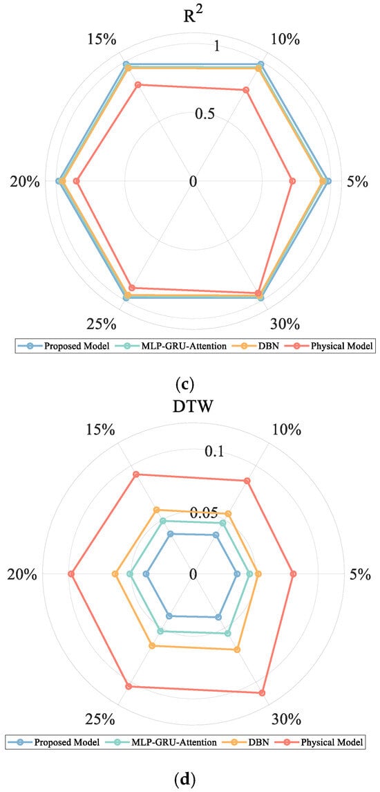 As observed in Figure 13, with the increase in training sample size, the prediction error metrics of all models show a decreasing trend. Even under the limited 20% training sample condition, the proposed method maintains relatively lower values in MAE, RMSE, and DTW metrics with the smallest performance degradation, highlighting the effective enhancement of model generalization capability in small-sample scenarios through physics-informed knowledge embedding. This phenomenon can be attributed to the physical guidance mechanism providing prior knowledge to the model, reducing its dependency on pure data volume, thereby enabling effective learning of complex nonlinear mapping relationships even with scarce data. In summary, the proposed model demonstrates superior prediction accuracy and data utilization efficiency across all four core evaluation metrics, with these advantages becoming particularly prominent under insufficient training sample conditions.