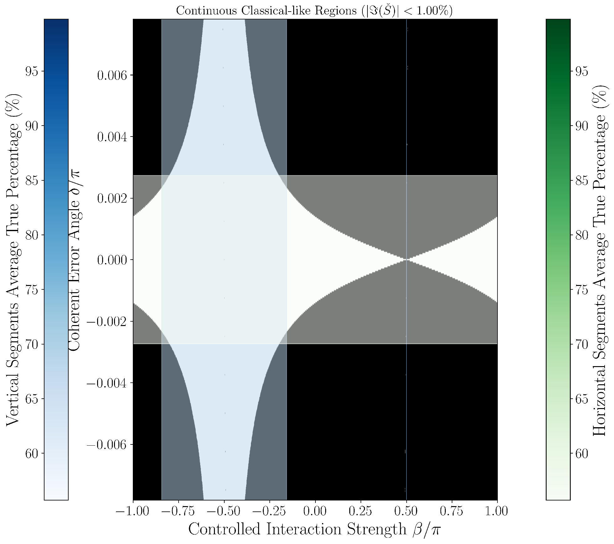 Figure 3. Continuous analysis of quantum-classical regions for threshold ϵ = 1.00 % . The hourglass structure remains robust across thresholds, with slightly more pronounced classical-like regions compared to the 0.63 % threshold (Figure 2). The overall topology and critical line positions remain remarkably consistent, validating the intrinsic nature of the phase boundaries. The classical-like rate for horizontal segments near δ = 0 is 55.70 % , confirming the protocol’s stability across threshold choices. The blue bar (left) shows the percentage scale for vertical segments (constant β ); the green bar (right) applies to horizontal segments (constant δ ). Each point’s color represents the fraction of classical-like behavior in its neighborhood, not a direct measurement at that point.