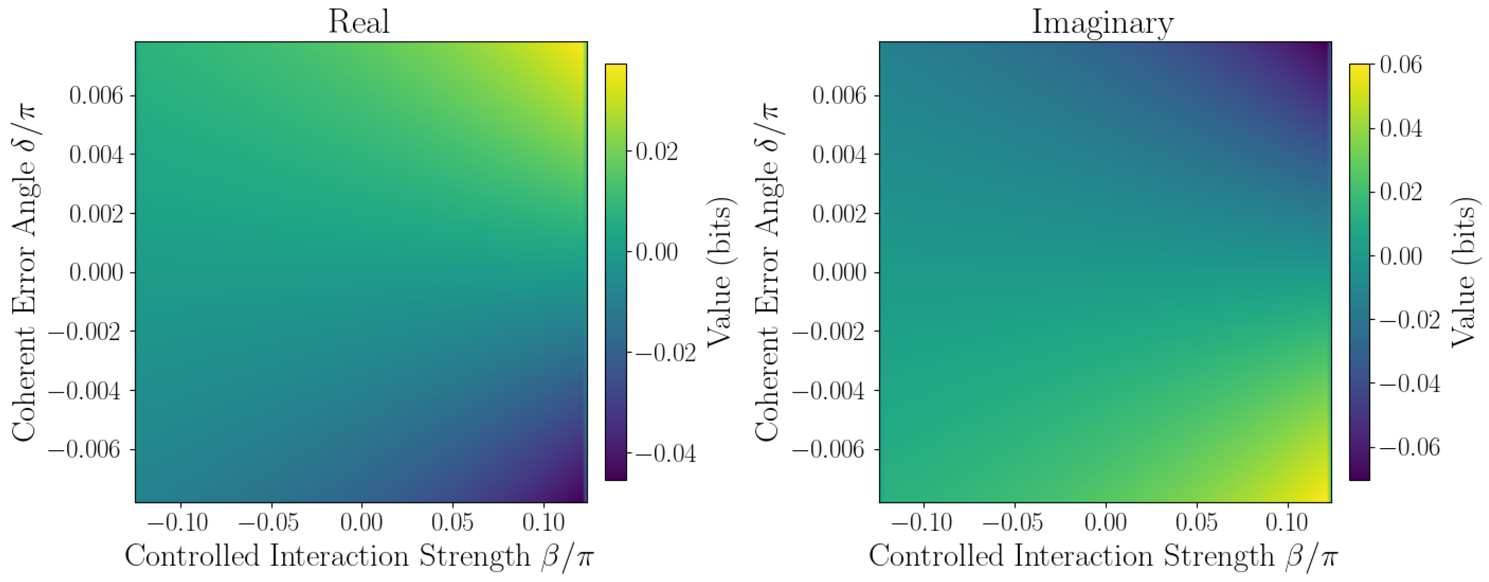 In our framework, the parameters β and δ serve distinct but complementary roles in managing coherent errors. β represents a controlled rotation angle actively adjusted during the calibration process. Calibration involves systematically scanning β to minimize the magnitude of the imaginary component of pseudo-entropy, S ˇ , thereby optimizing the intended interaction strength and reducing coherent phase errors. Conversely, δ models unknown systematic coherent phase deviations arising from hardware imperfections or drift. Benchmarking refers to the passive or ongoing monitoring of δ through measurements of S ˇ at fixed calibrated β values. This separation enables an efficient workflow: calibration actively optimizes system parameters by systematically varying β to minimize the measured error signature, specifically the imaginary part of pseudo-entropy (see Section 2.8 for details), while benchmarking provides continuous performance surveillance and error tracking (monitoring δ without parameter adjustment), signaling when recalibration is necessary.