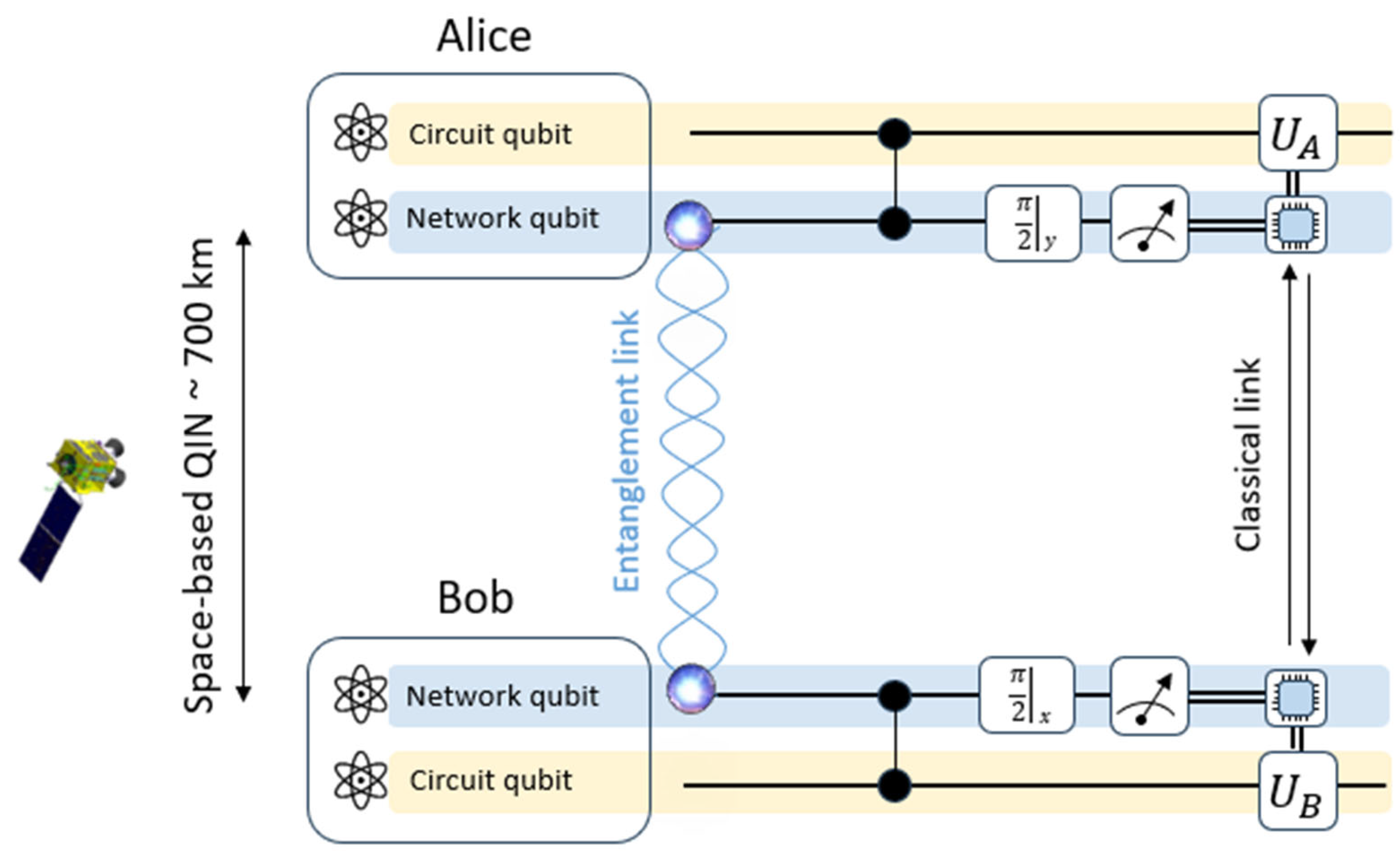 de Forges de Parny, L.; Paccard, L.; Bertrand, M.; Lazzarini, L.; Leloup, V.; Aymeric, R.; Blaise, A.; Molin, S.; Besancenot, P.; Laborde, C.; et al. Towards a Global Scale Quantum Information Network: A Study Applied to Satellite-Enabled Distributed Quantum Computing. Entropy 2025, 27, 1166. https://doi.org/10.3390/e27111166
