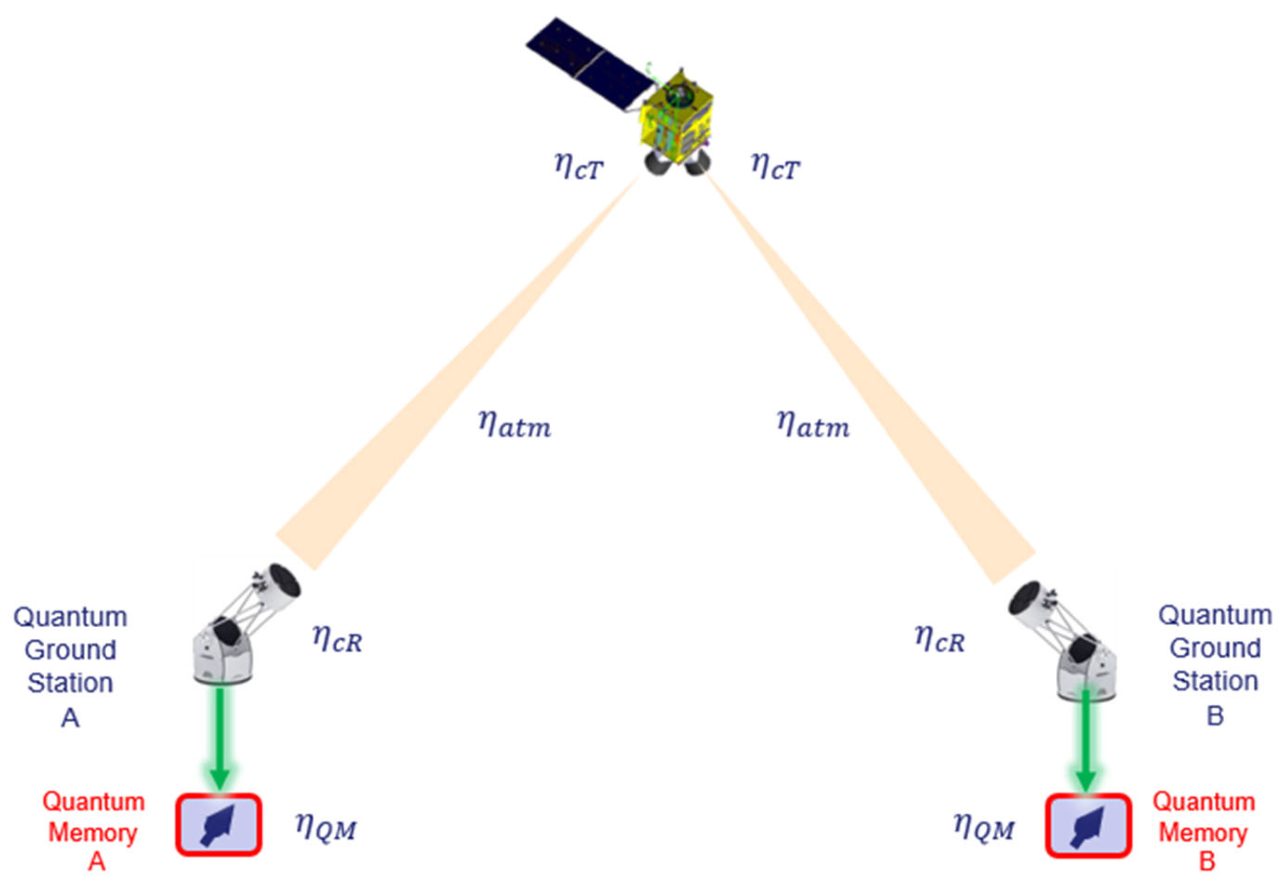 - , with being the wavelength conversion efficiency from 422 nm to 1550 nm (see use case section) and being the efficiency of quantum memory, given by Equation (A1) in the Appendix A;