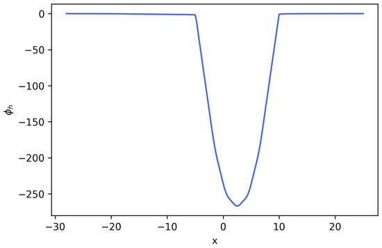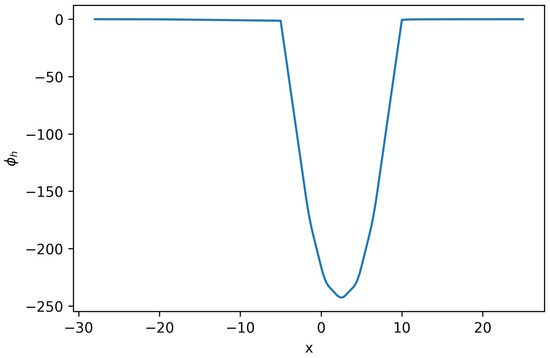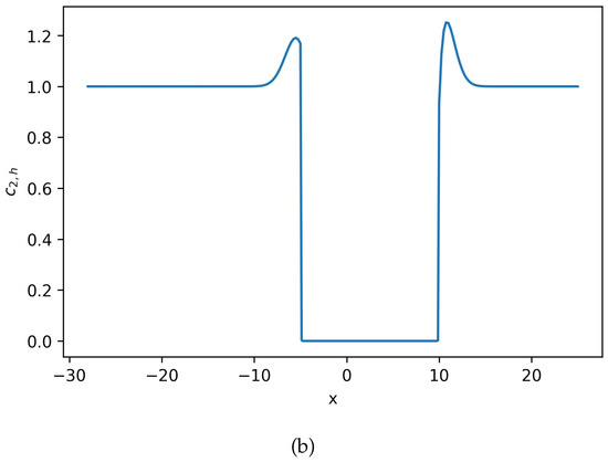We solve the system of Equation (23) using an HDG scheme for spatial discretization and an implicit Euler time-stepping scheme. The HDG stabilization parameters , , and take the same values assigned in Example 2. The physical parameters of the problem, except for A, also take the same values as Example 2. Using these defined parameter values, polynomial order , , and , the solution on domain at can be seen in Figure 9, Figure 10 and Figure 11. To easily compare these results to solutions from the previous examples, we include Figure 12, Figure 13 and Figure 14, which contain the two-dimension solution cut at .