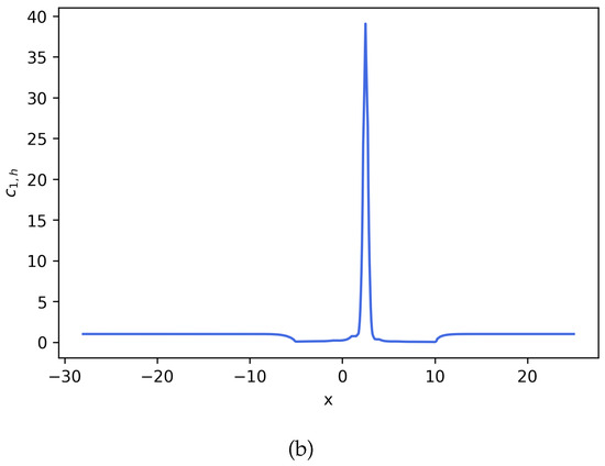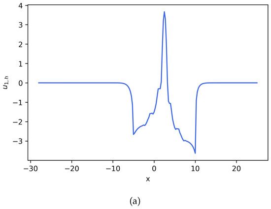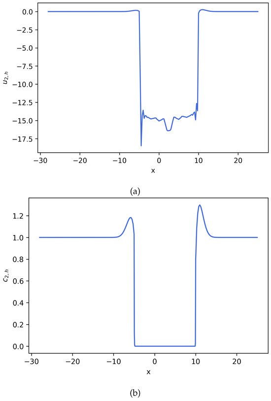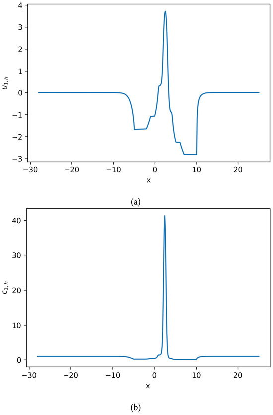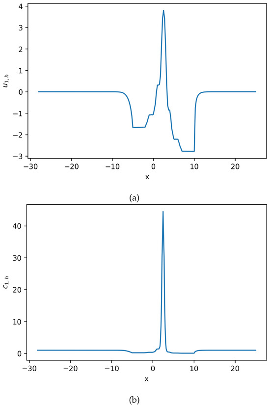 It can be seen that will be updated by . Using this BEFE time scheme, polynomial order , , and , the solution of the system of Equation (22) can be seen in Figure 5,Figure 6 and Figure 7.