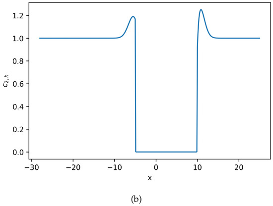 Here we show that our semi-discrete HDG scheme can also be combined with other time-stepping methods to yield a stable scheme, althrough we do not formally prove the stability of the fully discrete scheme. Similar to Example 2, our computational one-dimensional domain is . We solve the same model problem, Equation (22), and the same parameter values from Example 2. For the time discretization, we use the Backward Euler/Forward Euler (BEFE) scheme as described in Burkardt et al. (2020) [24]. This second-order accurate scheme is achieved by solving a Backward Euler scheme at a half time-step, to reach . Then, a Forward Euler scheme is solved for another half time-step to reach . For clarification, see the two half time-step equations below: