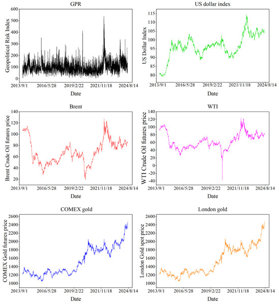 We select the GPR, the US Dollar Index, and the daily prices of Brent crude oil futures, WTI crude oil futures, COMEX gold futures, and London gold spot as sample data. The period ranges from 2 January 2014 to 15 July 2024, which covers the China–US trade war, the COVID-19 pandemic, and the Russian–Ukrainian conflict. The total number is 2505, which aligns dates and ignores missing data, including holidays. The GPR data are downloaded from the website “https://www.matteoiacoviello.com/gpr.htm (accessed on 20 July 2024)”. The remaining data are from the WIND database.