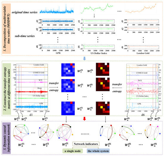 In order to reveal the dynamic evolution law and system dynamics characteristics of the nonlinear and multiscale causal relationship among geopolitical risk, US dollar index, and crude oil and gold prices. This paper proposes a causal information network based on the maximal overlap discrete wavelet transform model, transfer entropy model, and complex network theory to study the nonlinear causal relationships among GPR, the US dollar index, and the prices of crude oil and gold. First, the maximum overlap discrete wavelet transform model is used to decompose the original time series into sub-time series at multiple scales, aiming to explore the short-, medium- and long-scale evolutionary characteristics among variables. Second, the sub-time series on the same time scale can be mapped into a sequence of windows evolving into one another. Then, a transfer entropy matrix in a window can be obtained via the transfer entropy model, which represents the causal information transmission among variables. This suggests there is a sequence of transfer entropy matrices to describe the dynamic process of causal information transmission among these variables. Third, a transfer entropy matrix can be transferred into a directed weighted network referred to as a causal information network. The node in a network represents a sub-time series in a window, and the directed weighted edge is the causal information transmission from one sub-time series to another. The dynamic topology structure of a causal information network is investigated to identify important variables in the dynamic process at each time scale and to analyze the evolutionary structure of the network as a whole. The process is illustrated in Figure 2.