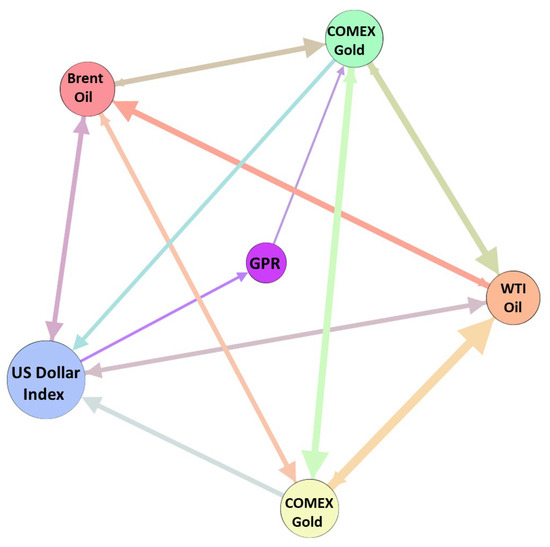 Many studies have investigated the causal relationship between geopolitical risk and financial markets. Shahbaz et al. [19] used the Granger test to explore the causality between geopolitical risk and oil prices, which provide a reference for studying the influence of geopolitical risk on the oil market. Su et al. [20] adopted a rolling window and the Granger approach to investigate the causal relationship between geopolitical risk and crude oil, reflecting that the relationship is dynamic. Zhang et al. [21] studied the heterogeneity of time-varying causality between geopolitical risk and green financial markets, indicating that important causal relationships often occur during emergencies. Huang et al. [1] analyzed the causality between geopolitical risk and the gold market via the causality-in-quantiles method and proved that the influence of different kinds of political events on the gold market varies. Zhao et al. [22] used transfer entropy to analyze the dynamic causality and systematic risk of bulk commodity prices. Kara et al. [6] combined a rolling window and causal model to study the interactions among geopolitical risk, WTI, and gold prices. Duan et al. [23] evaluated the time-varying causal effects among geopolitical risk, crude oil, and the dollar rate. Qin et al. [24] discussed the Granger causality between Russia’s geopolitical situation and gold price. There is considerable research potential between geopolitical events and crude oil, gold, and the US dollar [1,6,19,23,24,25]. Above all, previous studies have focused on the linear or nonlinear causal relationships among multiple variables via econometric models or hybrid models based on complex networks from a signal time scale. Therefore, a new model needs to be proposed to study the dynamic nonlinear causal relationships among multiple variables at multiple time scales.