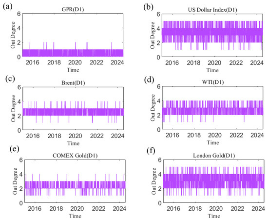 The out degree of each variable at the D1 scale varies with time. (a) geopolitical risk; (b) US Dollar Index; (c) Brent crude oil; (d) WTI crude oil; (e) COMEX gold; (f) London gold.