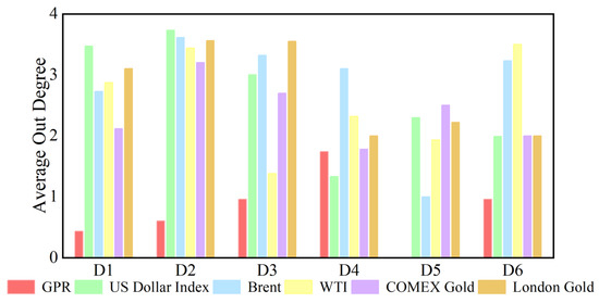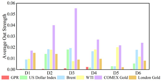 In the analysis of this paper, the out strength measures the strength of a variable’s influence on other variables. The dynamic causal out strength of each variable at the D1 scale is shown in Figure 10, and the dynamic out strength of each variable at other time scales is shown in Appendix C. The out strength of causal information transmitted to others by geopolitical risks, the dollar index, and crude oil and gold prices all change over time. The time-varying characteristics of causal information outflow are different at different time scales, showing that its changes are related to time scales. Figure 11 shows the average out strength of the six variables at the D1–D6 scales. For example, COMEX gold has the largest value at the D1 scale and has the greatest influence on other variables in the past ten years. The out strength of geopolitical risk is the smallest at scale D1. The results show that gold is the most important causal information transmitter.