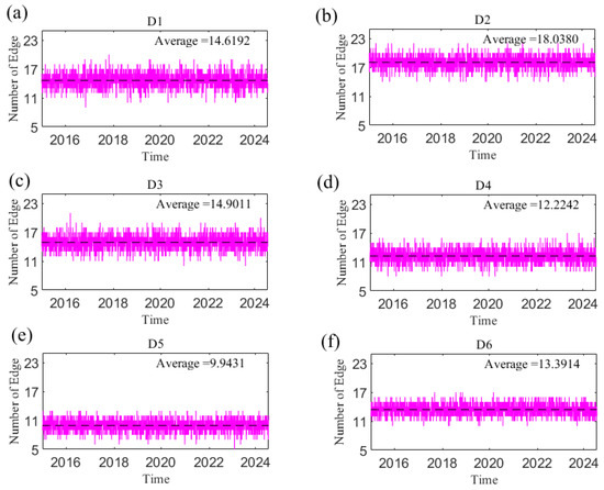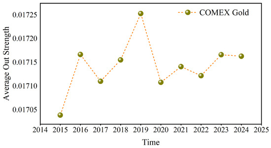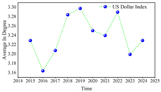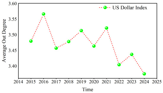 Taking the US dollar index in D1 as an example, the average value of its annual out degree is calculated, as shown in Figure 6. The results indicate that the maximum value occurs in 2016, while the minimum occurs in 2024. Owing to the outbreak of the COVID-19 pandemic in 2020, global trading and investment activity decreased, which curbed the role of the US dollar, and then the US dollar’s out degree rose as the economy recovered. The out degree of the US dollar rapidly declined when the Russian–Ukrainian conflict occurred in 2022, reaching its lowest value in 2024.