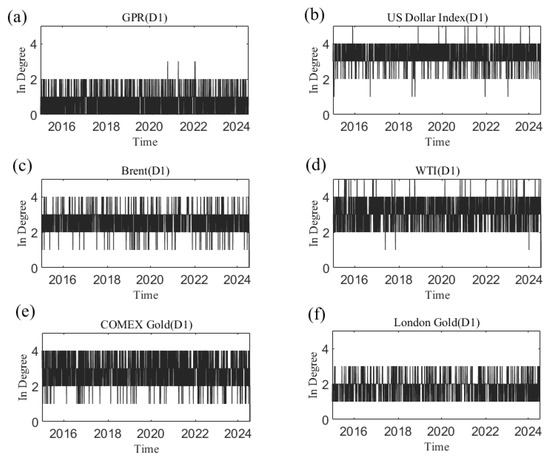 The in degree of each variable at the D1 scale varies with time. (a) geopolitical risk; (b) US Dollar Index; (c) Brent crude oil; (d) WTI crude oil; (e) COMEX gold; (f) London gold.