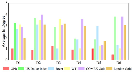 Figure 7 shows the dynamic in degree for each variable at the D1 time scale. Appendix B shows the change in each variable’s in degree with time at other time scales. We can see that the number of causal information receivers changes over time on a time scale. The time-varying characteristics at different time scales differ in terms of degree. Additionally, the average degree of each variable at different time scales is reflected in Figure 8. For example, at scale D1, the average in degree of the US dollar is the greatest, and the average out degree of geopolitical risk is the smallest. The average in degree of geopolitical risk is the most stable at the D1–D6 scales, indicating that as the time scale changes, the number of neighbors of geopolitical risk as the receiver of causal information does not change significantly with increasing time scales.