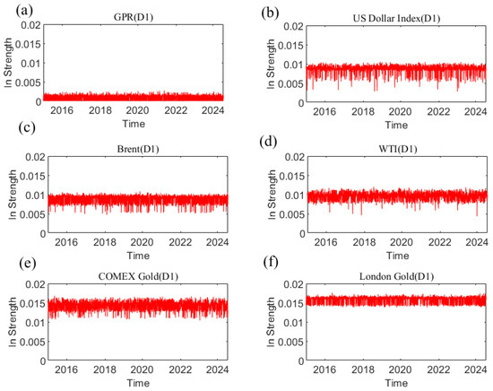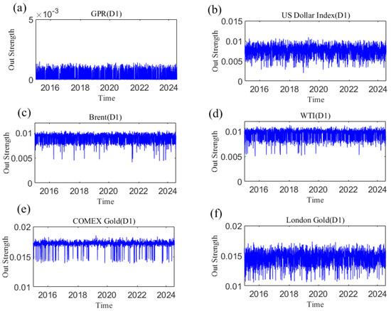 The out strength of each variable at the D1 scale varies with time. (a) geopolitical risk; (b) US Dollar Index; (c) Brent crude oil; (d) WTI crude oil; (e) COMEX gold; (f) London gold.