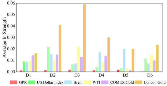 The in strength measures how strongly each variable is affected by other variables. The greater the weight is, the easier it is to be influenced by other variables. Figure 12 shows the dynamic in strength of each variable at the D1 scale. Please refer to Appendix D to understand the dynamic in strength of each variable at other time scales. The results indicate that the in strength of geopolitical risk, the US dollar, and the price of crude oil and gold receiving causal information from others is time-varying. The dynamic characteristics of the in strength at different time scales are different, reflecting that the causal information inflow characteristics are related to the time scale. Figure 13 indicates the average in strength of the six variables at different scales. At scale D1, the average strength of London gold is the highest, indicating that London gold, as the receiver of dynamic causal information of other variables, has the greatest intensity and is most easily influenced by other variables, whereas the strength of geopolitical risk is the smallest. The combination of the out strength and in strength of each variable at the other scales in the Appendix suggests that the interaction among variables in the system gradually weakens as the time scale increases.