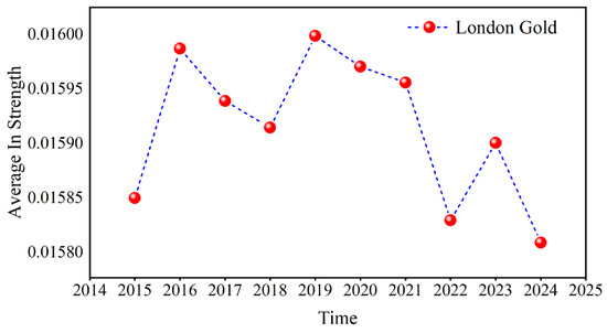 After the upward trend, some countries impacted by supply disruptions gradually resumed crude oil production, resulting in increased supply and thus lower crude oil prices. In addition, Donald Trump’s election as US President in late 2016 and early 2017 triggered significant changes and uncertainties in US domestic and international policies. For instance, the Trump administration adopted more protectionist trade policies, including the imposition of tariffs on Chinese goods. This might have affected world trade and the economy, which might then have affected crude oil demand. In 2018, Iran’s crude oil exports significantly decreased because of the United States’s reimposition of sanctions against the country. Crude oil production has decreased due to Venezuela’s economic crisis. These factors have made the availability of crude oil more unpredictable globally, leading market participants to anticipate a shortfall and pushing up oil prices. With the frequent occurrence of black swan events such as the China–US trade war in 2018 and the attack of a Saudi Arabian oil facility in 2019, the hedging effect of gold on crude oil was further enhanced. The COVID-19 pandemic commenced in early 2020, drastically harming the global economy and sharply reducing demand. In April 2020, oil prices declined by a historically large amount. However, as the pandemic was contained and the economy slowly recovered, oil prices started to increase in the middle of the year. After the outbreak of the Russian–Ukrainian conflict in 2022 and the Israel–Hamas conflict in 2023, Russia’s crude oil production was lower than before the conflict, geopolitical risks in the Middle East increased, and crude oil exports from neighboring countries such as Iran were limited, exacerbating global trade risks and crude oil market concerns about supply and demand, driving gold prices higher, but investor risk aversion gradually subsided as the situation eased. Figure 14 and Figure 15 reveal that the influence of gold weakened in 2016. In 2019, the out strength and in strength of gold reached its peak, and then fell back to a stable level. In 2023, it showed an upward trend and then declined. The above analysis shows that when the local political risk increases, the influence of gold as a hedging tool in the causal information network increases, and the investment hedging effect on the crude oil market is more obvious.