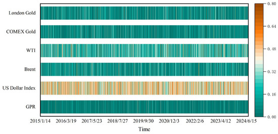 The in strength of each variable at the D1 scale varies with time. (a) geopolitical risk; (b) US Dollar Index; (c) Brent crude oil; (d) WTI crude oil; (e) COMEX gold; (f) London gold.