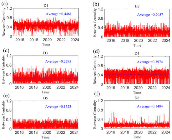 The betweenness centrality of US dollar index at the D1–D6 scales. (a) D1 scale; (b) D2 scale; (c) D3 scale; (d) D4 scale; (e) D5 scale; (f) D6 scale. Note: The dotted line in the figure represents the average value.