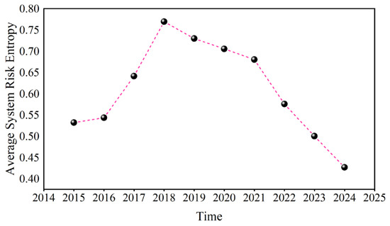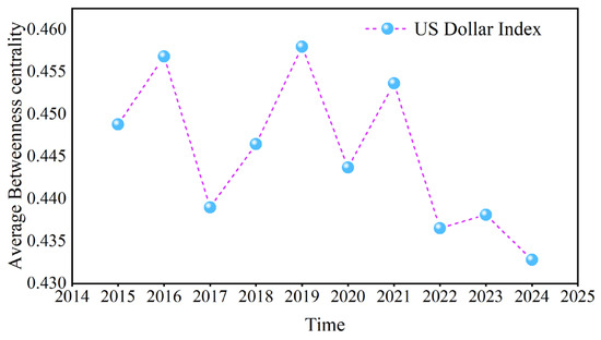 Taking the betweenness centrality of the US dollar at D1 as an example, Figure 18 calculates the annual average to further analyze its change. The maximum value occurred in 2019, and the minimum value occurred in 2024. The China–US trade war in 2018 enhanced the ability of the US dollar to transmit information in the causal information network, whereas the COVID-19 pandemic, the Russian–Ukrainian conflict, and the Israel–Hamas conflict weakened this ability.