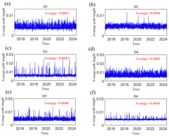 On the basis of the method discussed in Section 2, first, MODWT is used to reconstruct the series of geopolitical risk, dollar index, Brent crude oil price, WTI crude oil price, COMEX gold price, and London gold price into multiple sub-time series; since there are investors with different investment horizons in the market, they focus on different information scales. The number of time scale decomposition is set to 6 [43]. Because the time interval is days, the time period corresponding to the first layer scale is 2–4 days, the second layer scale is 4–8 days, and the third layer scale is 8–16 days. The fourth scale corresponds to 16–32 days, the fifth scale corresponds to 32–64 days, and the sixth scale corresponds to 64–128 days. D1, D2, D3, D4, D5, and D6 are the details of each layer, and S is the approximate value. The details are shown in Table 2. Second, the entire sequence of the same scale is divided into a sequence of fragments using a rolling window. The width of the window θ is 240 days, excluding holidays and rest days, equivalent to a one-year economic cycle; each scale has 2505-θ + 1 rolling windows. Following this, the transfer entropy matrix of geopolitical risk, the dollar index, and crude oil and gold prices under the action of the rolling window is subsequently calculated. Third, the causal information transmission matrix is transformed into a directed weighted network, the transmission networks of six sets of data at six time scales are obtained, and a sequence of networks is generated at each scale. By measuring the network indicators, the time-varying nonlinear causal relationships among geopolitical risk, the dollar index, and crude oil and gold prices are compared and analyzed from short-, medium- and long-scale perspectives.