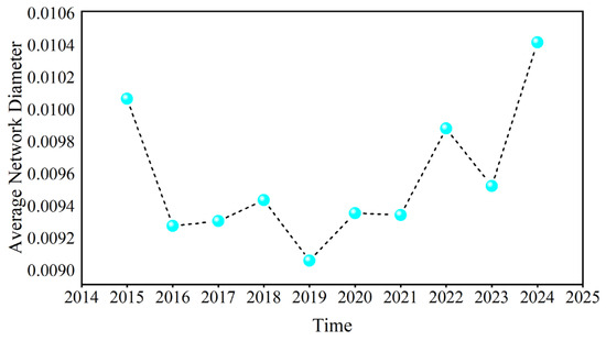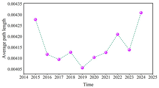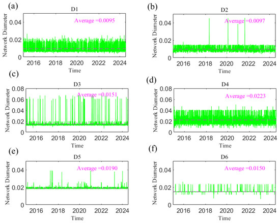 The average path length (L) is an important index for evaluating information efficiency in a network. In the network, a node can reach another node through one or more different paths. The path with the least number of network edges between node and node is called the shortest path (), and the average path length (L) is the average value of the shortest path between all nodes in the network. The maximum value of the shortest path () in the network is the diameter of the network (d). The smaller the two indicators are, the better the integrity of the network, and the faster the causal relationship transmission between markets. The calculation formulas for the L and D are as follows: