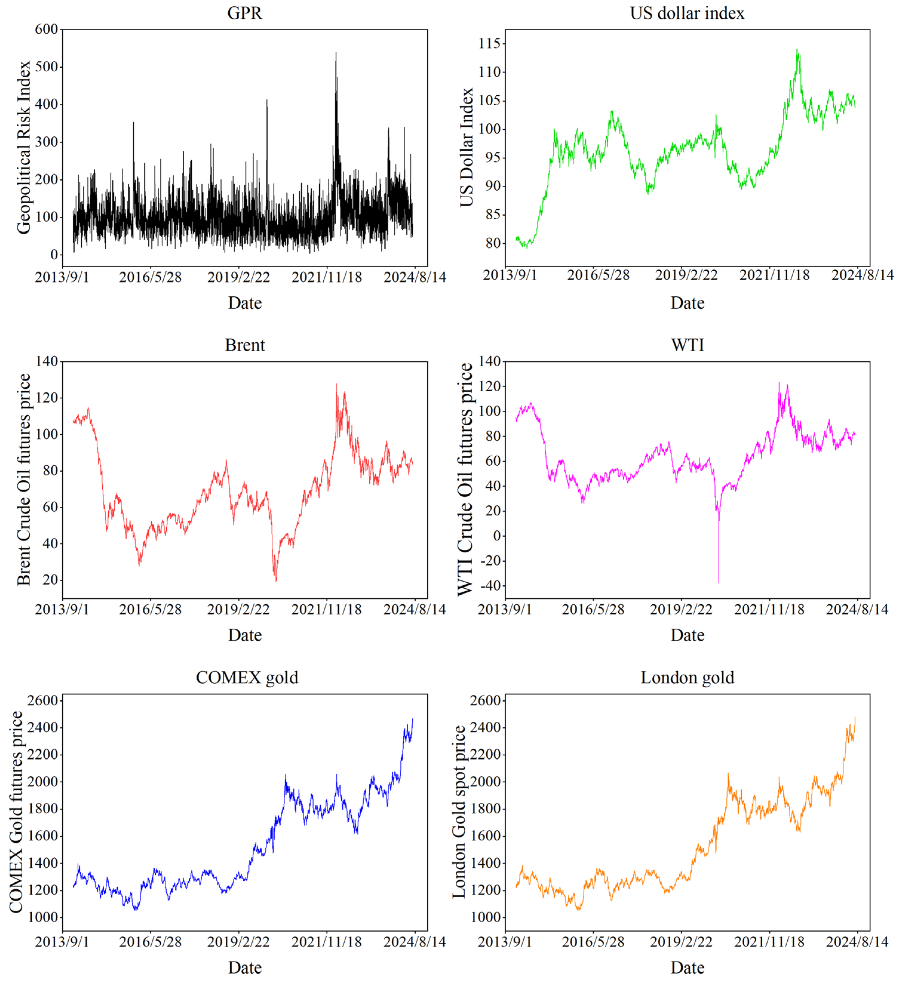 10], and is an important raw material in global industrial production. Russia and Israel’s neighboring regions are significant players in the import and export of crude oil, while the US dollar is the main currency for crude oil trading, indicating that there is a close relationship among crude oil price, the US dollar, and geopolitical risk. Additionally, as an investment product, crude oil has a strong financial attribute. Gold, characterized by its properties as a precious metal and a form of currency, serves as a means of value preservation [