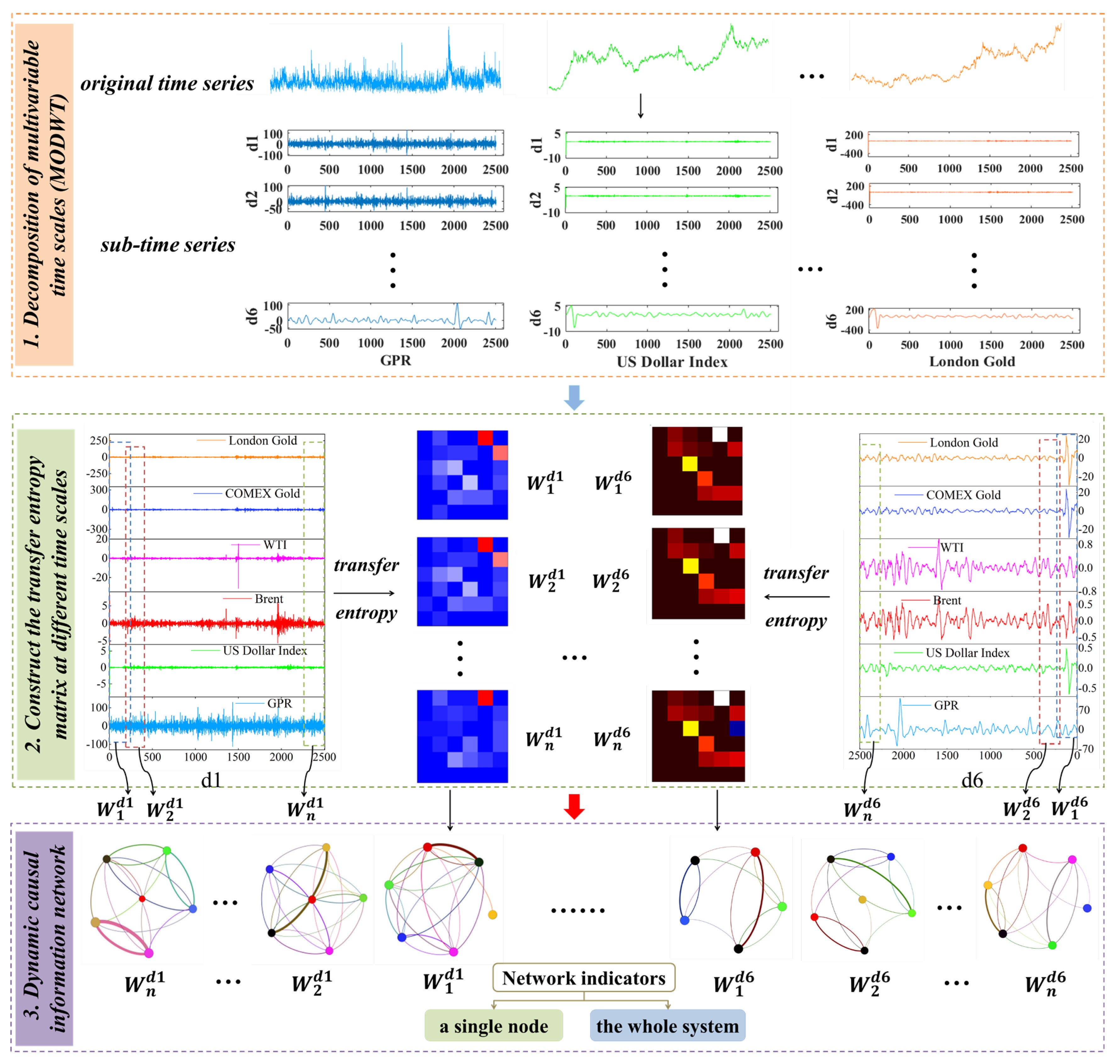 Table 2. Second, the entire sequence of the same scale is divided into a sequence of fragments using a rolling window. The width of the window θ is 240 days, excluding holidays and rest days, equivalent to a one-year economic cycle; each scale has 2505-θ + 1 rolling windows. Following this, the transfer entropy matrix of geopolitical risk, the dollar index, and crude oil and gold prices under the action of the rolling window is subsequently calculated. Third, the causal information transmission matrix is transformed into a directed weighted network, the transmission networks of six sets of data at six time scales are obtained, and a sequence of networks is generated at each scale. By measuring the network indicators, the time-varying nonlinear causal relationships among geopolitical risk, the dollar index, and crude oil and gold prices are compared and analyzed from short-, medium- and long-scale perspectives.