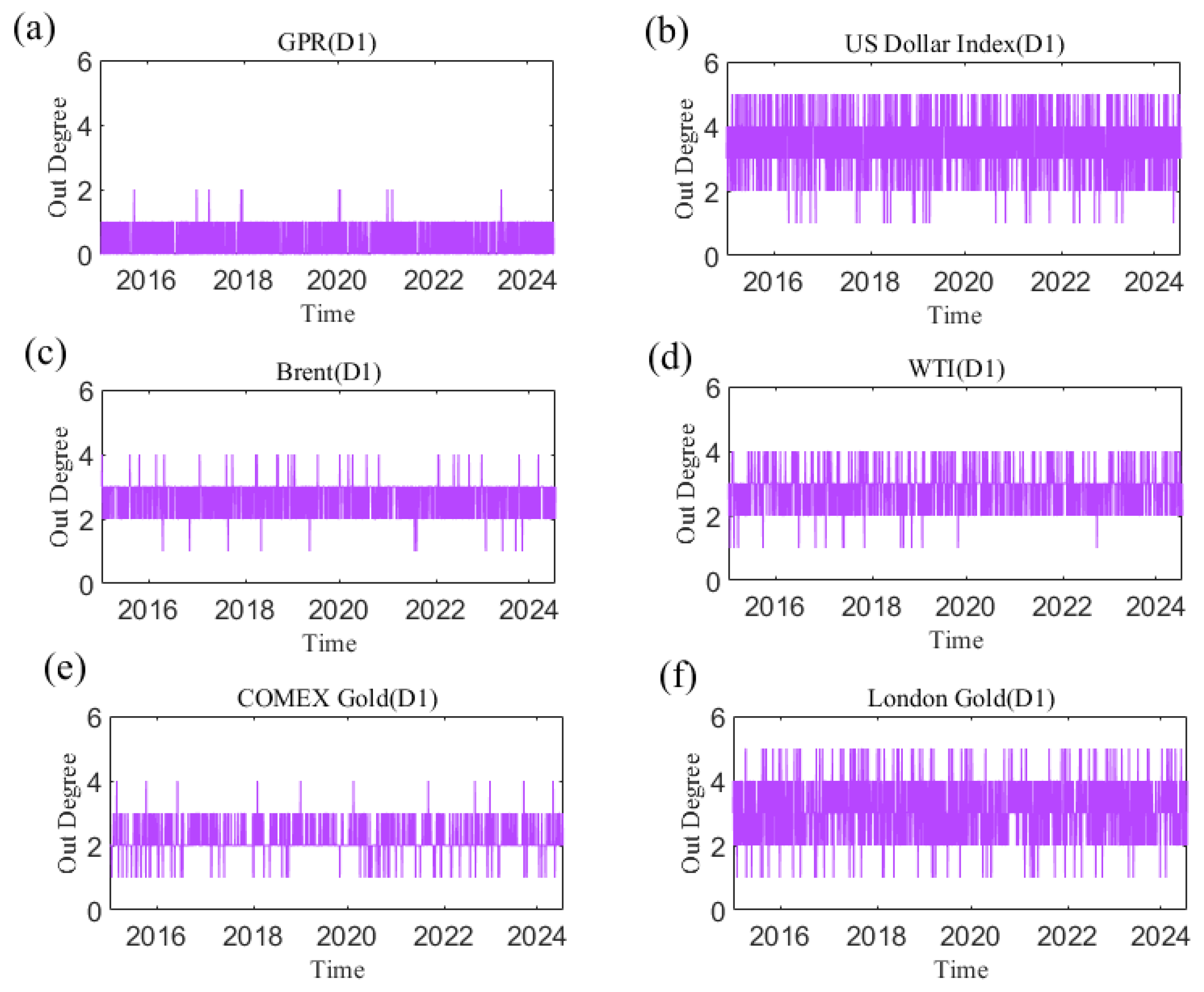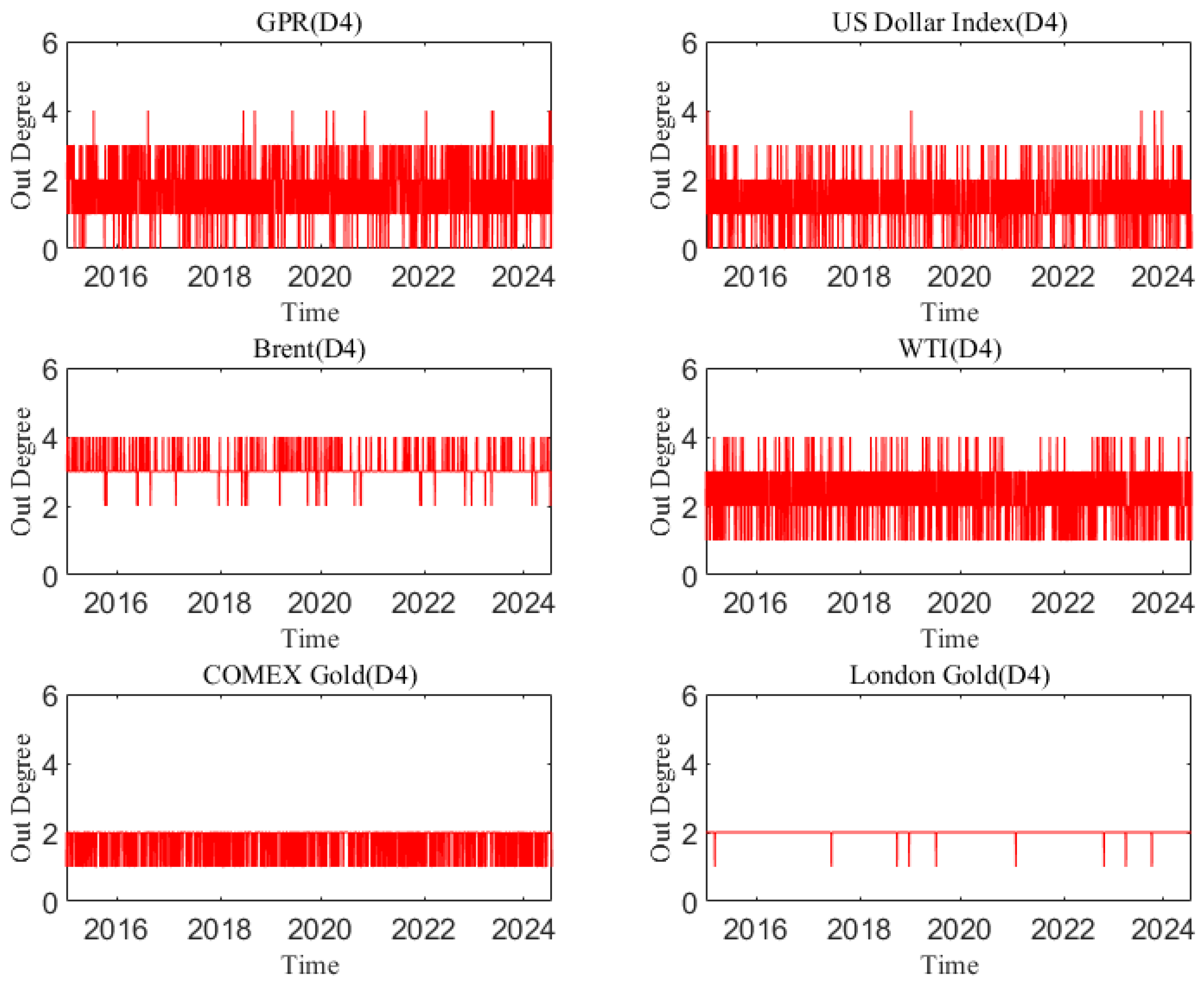 Third, when geopolitical risk is elevated, it often coincides with heightened activity in the gold market. The more obvious the hedging effect of gold as a hedging tool on the crude oil market, the stronger its dominant position within the causal information network.