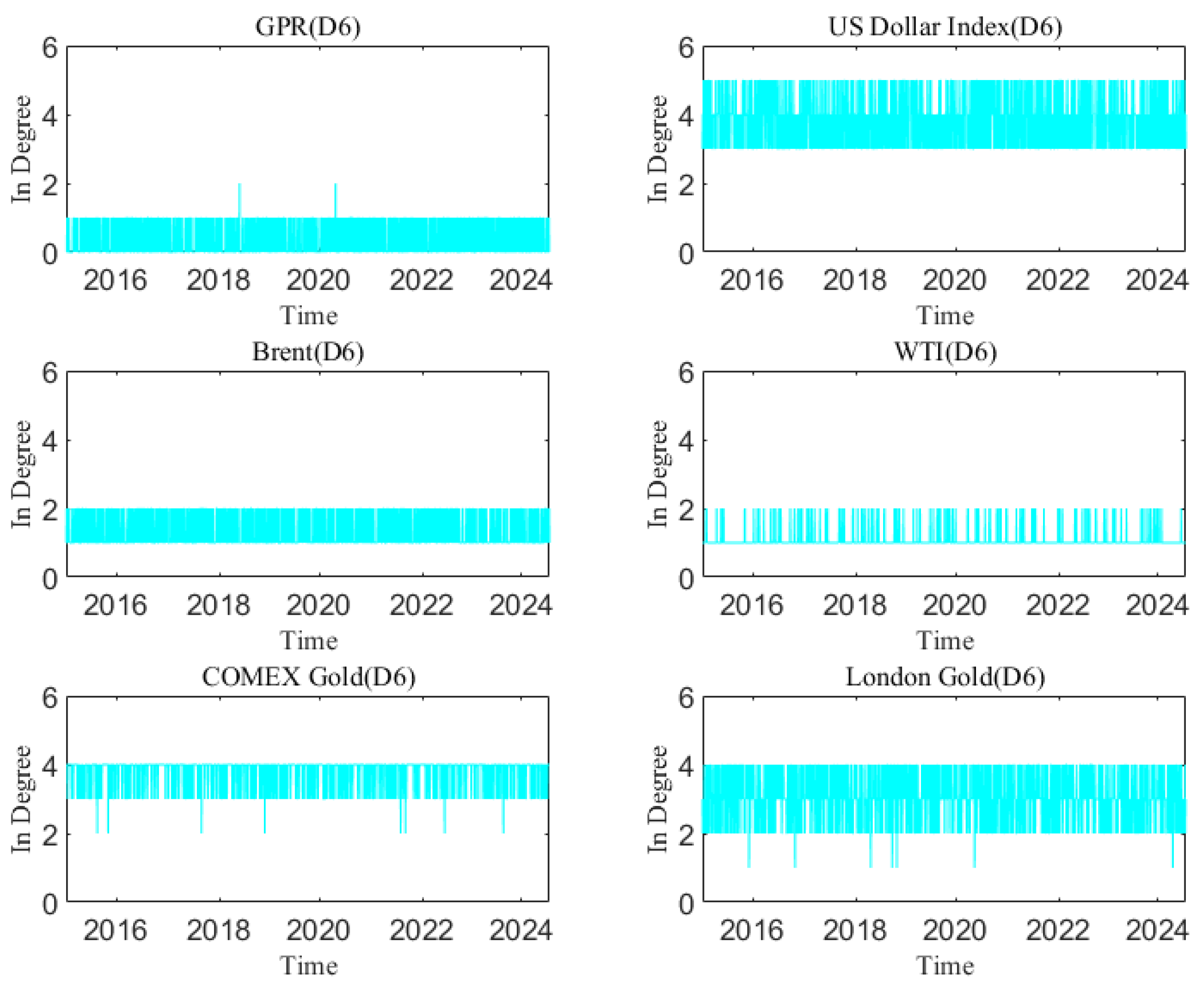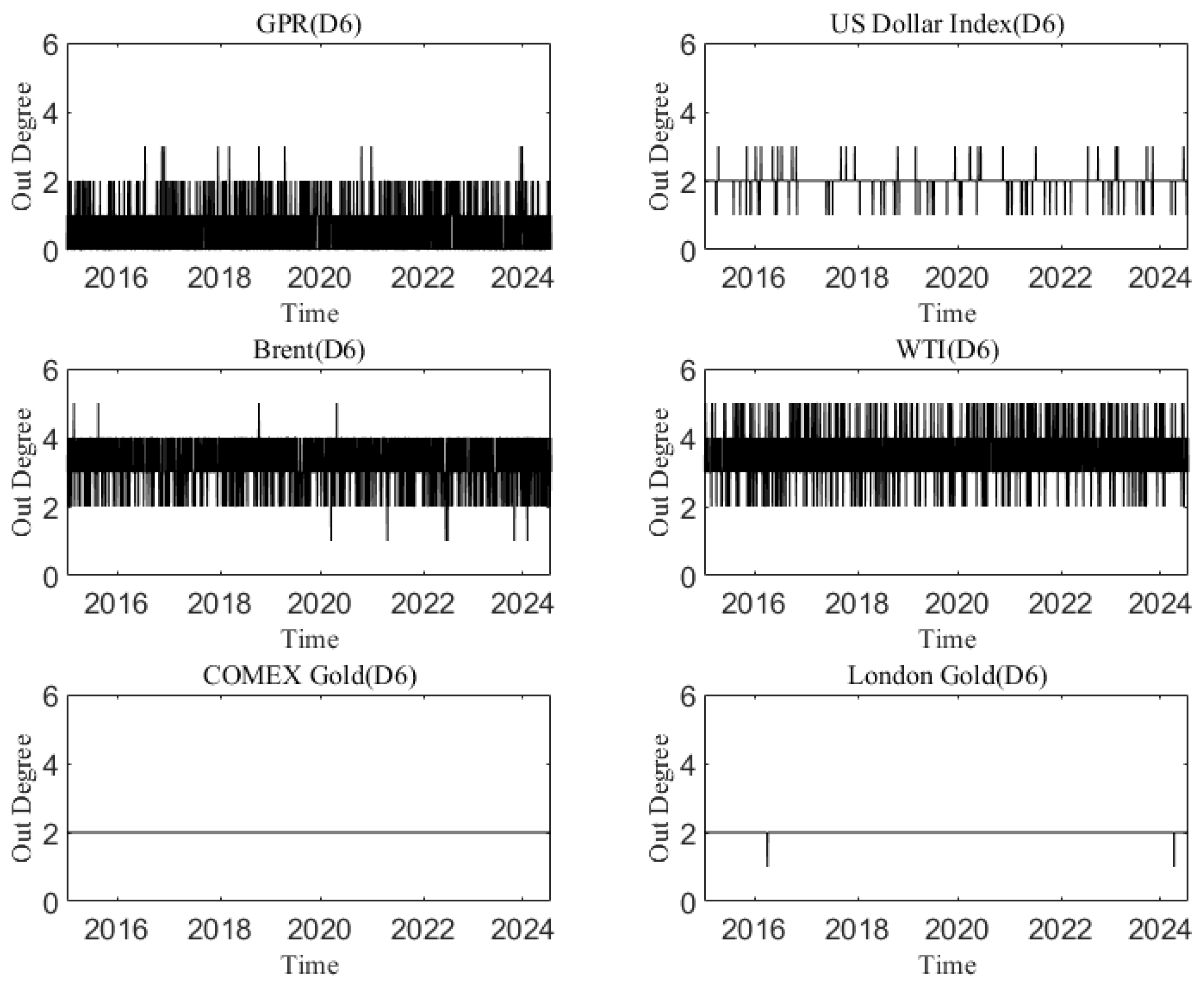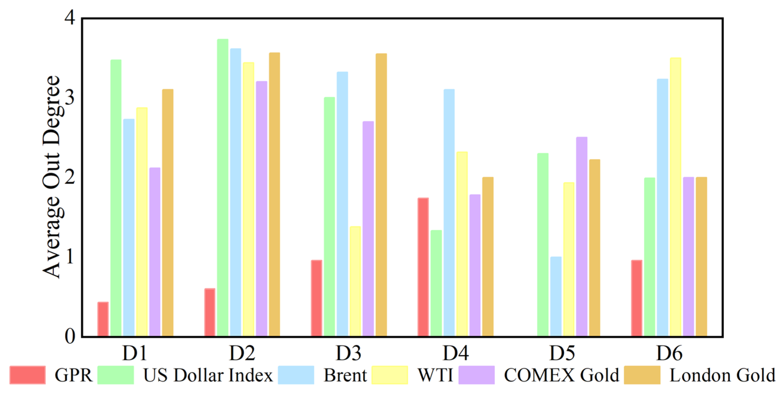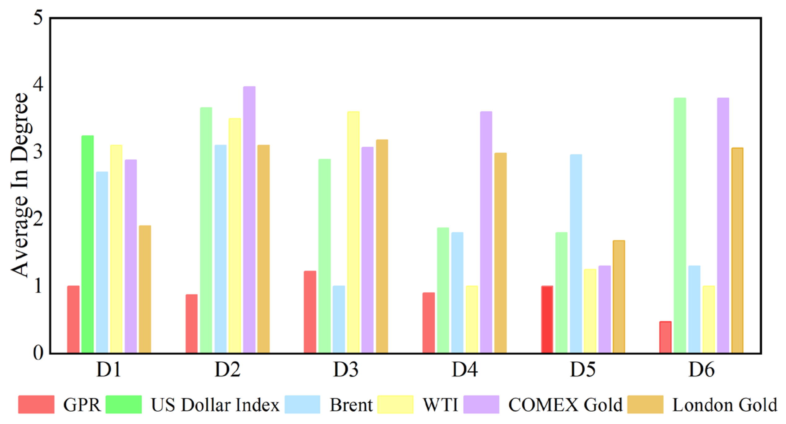 Figure 8. For example, at scale D1, the average in degree of the US dollar is the greatest, and the average out degree of geopolitical risk is the smallest. The average in degree of geopolitical risk is the most stable at the D1–D6 scales, indicating that as the time scale changes, the number of neighbors of geopolitical risk as the receiver of causal information does not change significantly with increasing time scales.