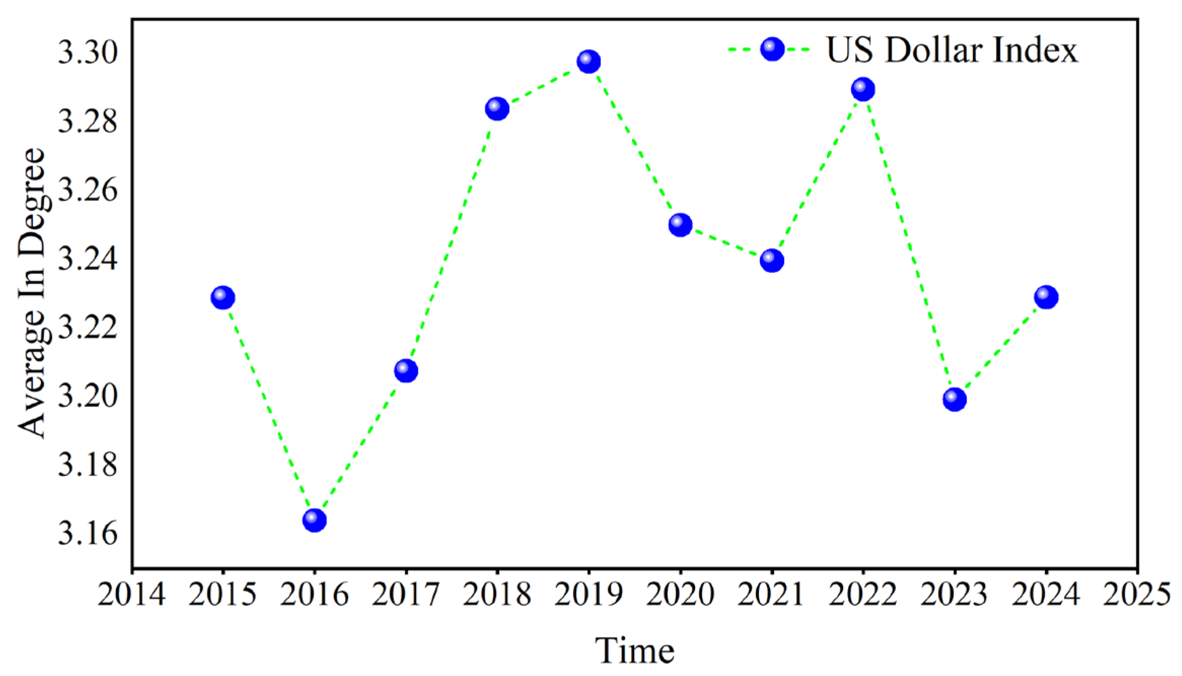 Figure 6. The results indicate that the maximum value occurs in 2016, while the minimum occurs in 2024. Owing to the outbreak of the COVID-19 pandemic in 2020, global trading and investment activity decreased, which curbed the role of the US dollar, and then the US dollar’s out degree rose as the economy recovered. The out degree of the US dollar rapidly declined when the Russian–Ukrainian conflict occurred in 2022, reaching its lowest value in 2024.