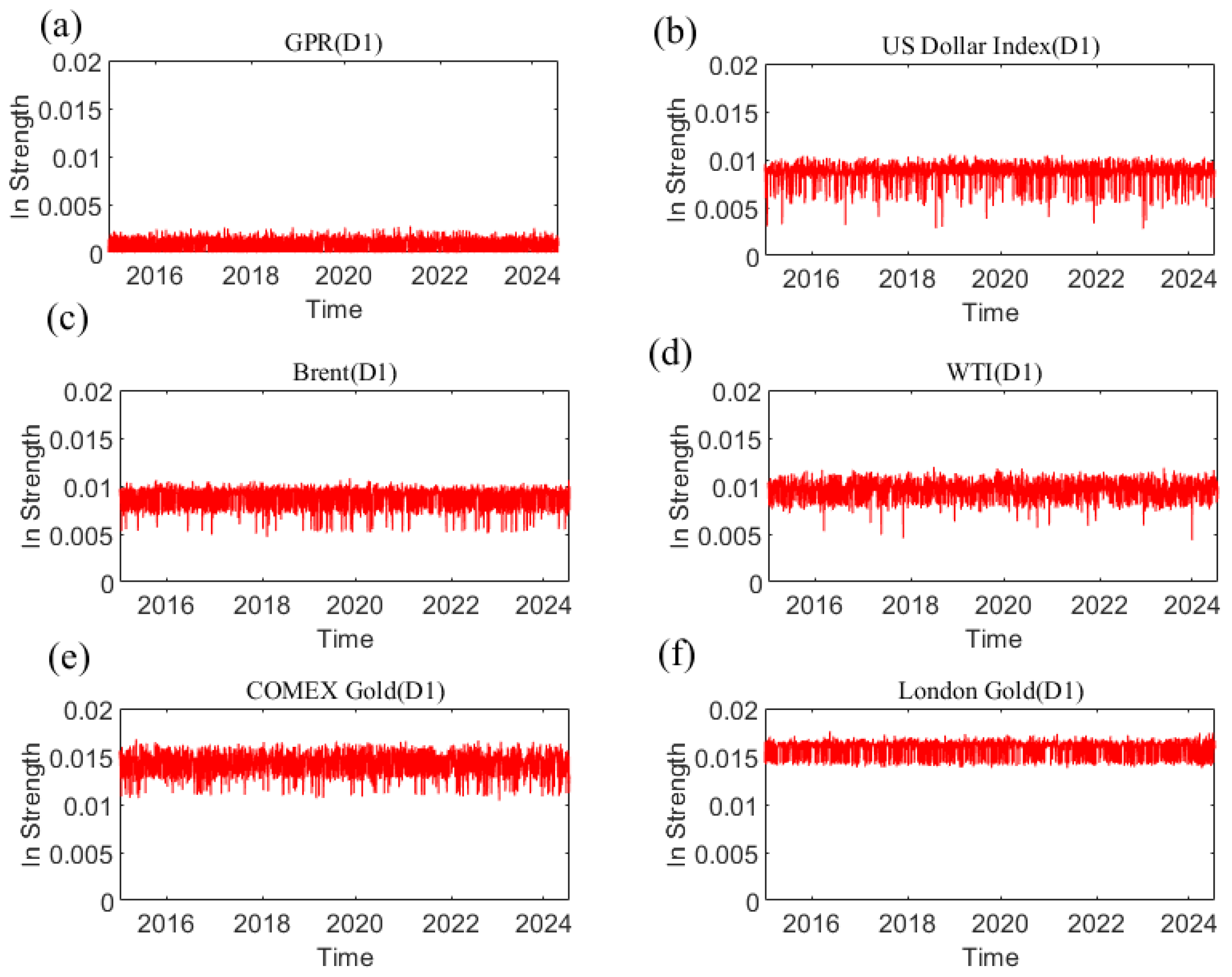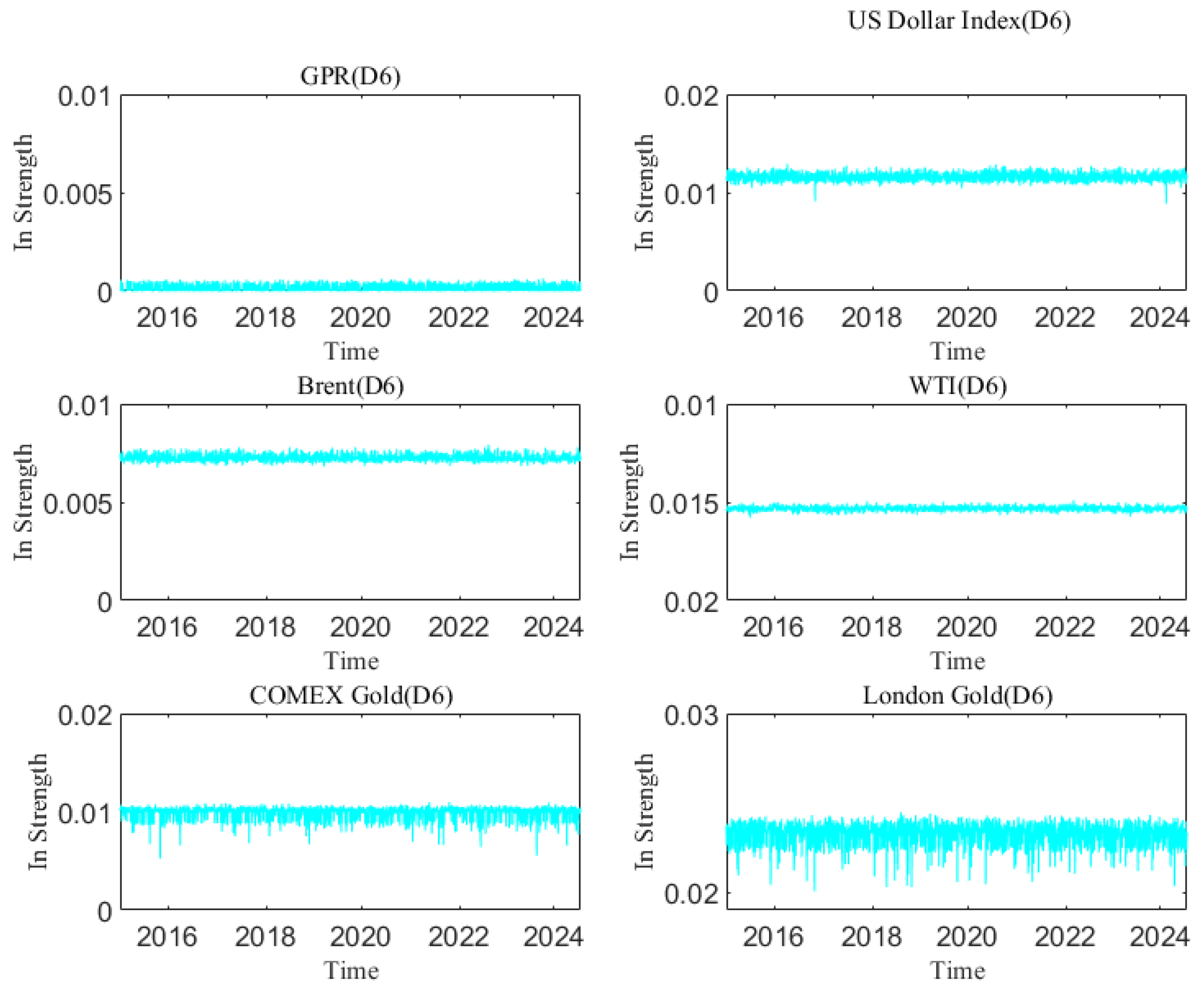 Section 2, first, MODWT is used to reconstruct the series of geopolitical risk, dollar index, Brent crude oil price, WTI crude oil price, COMEX gold price, and London gold price into multiple sub-time series; since there are investors with different investment horizons in the market, they focus on different information scales. The number of time scale decomposition is set to 6 [