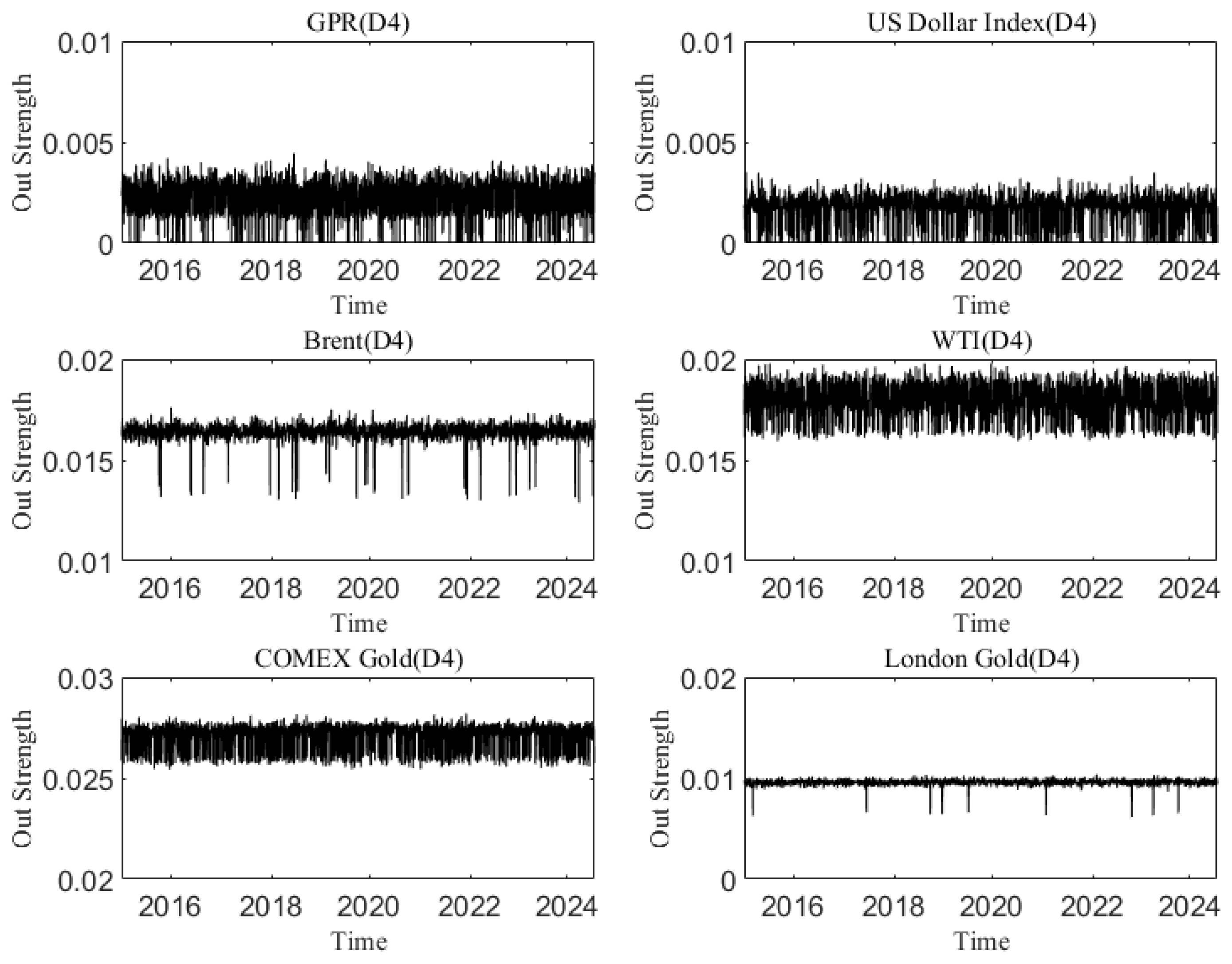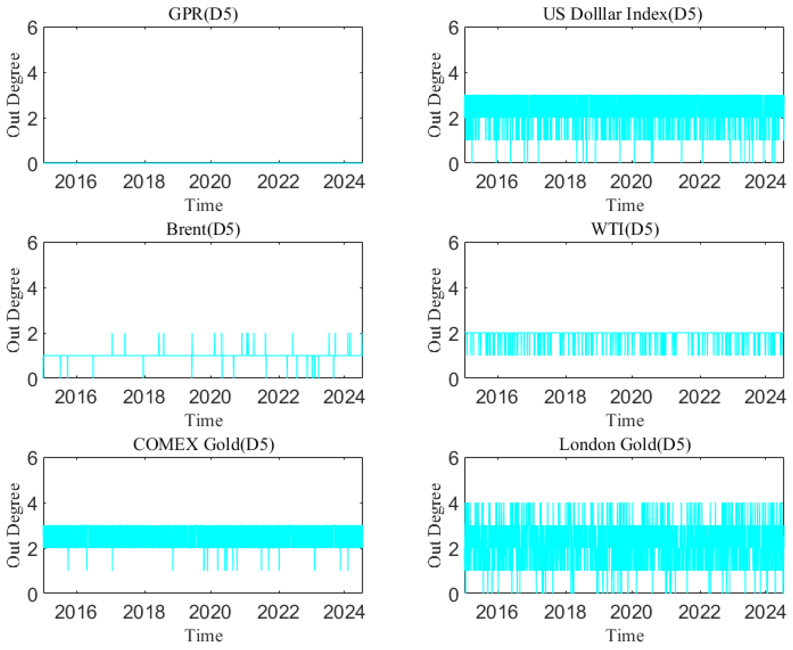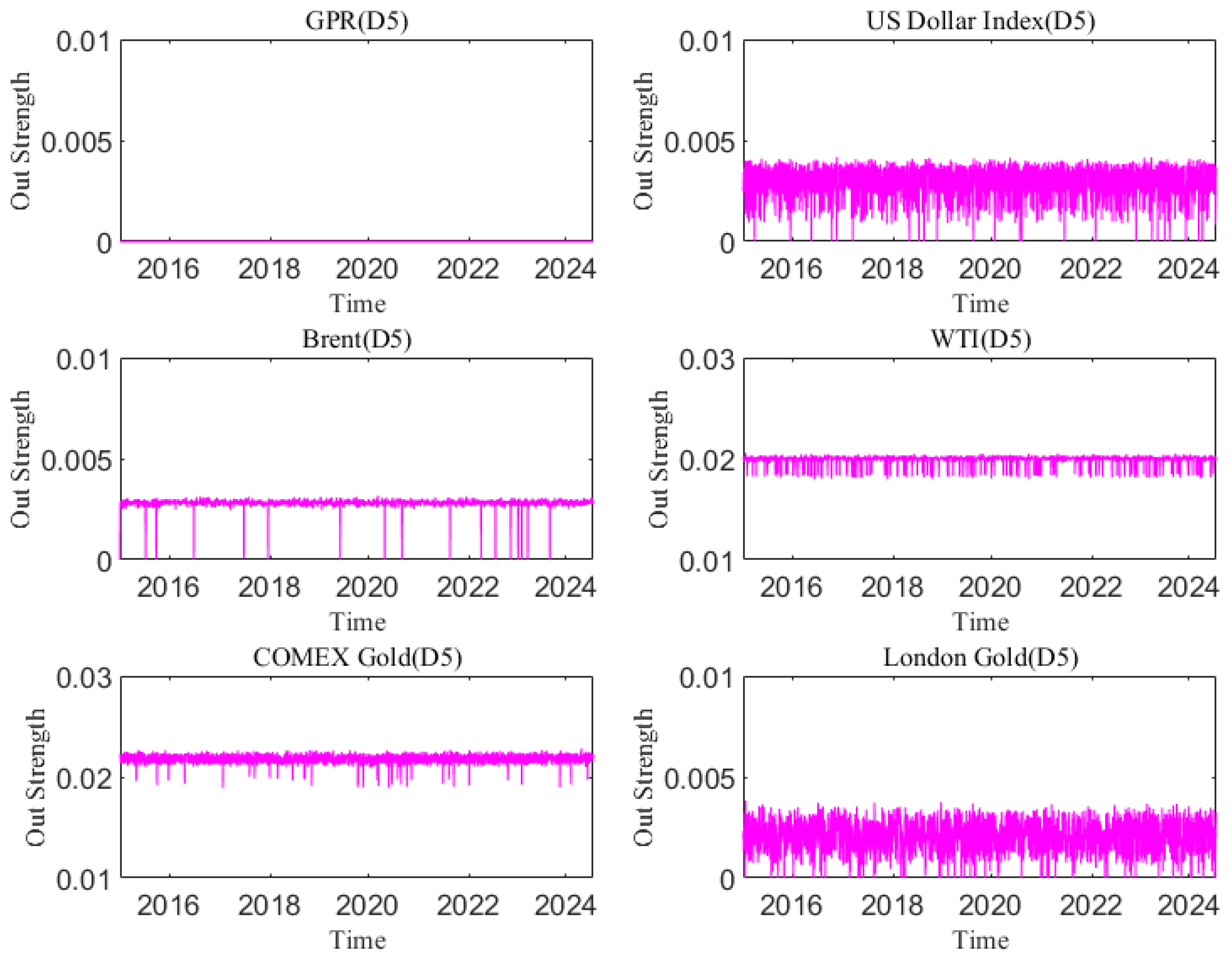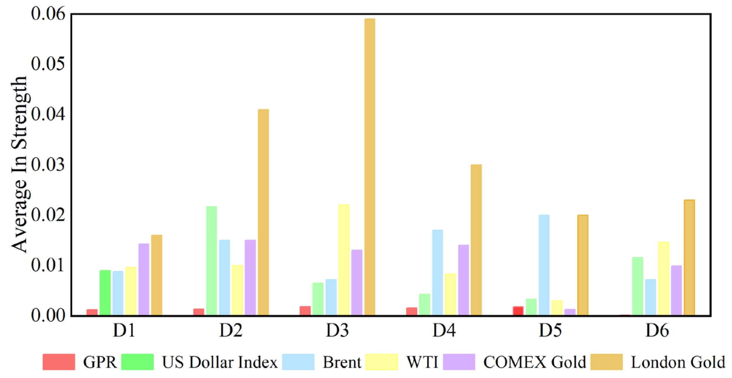 Appendix D to understand the dynamic in strength of each variable at other time scales. The results indicate that the in strength of geopolitical risk, the US dollar, and the price of crude oil and gold receiving causal information from others is time-varying. The dynamic characteristics of the in strength at different time scales are different, reflecting that the causal information inflow characteristics are related to the time scale.