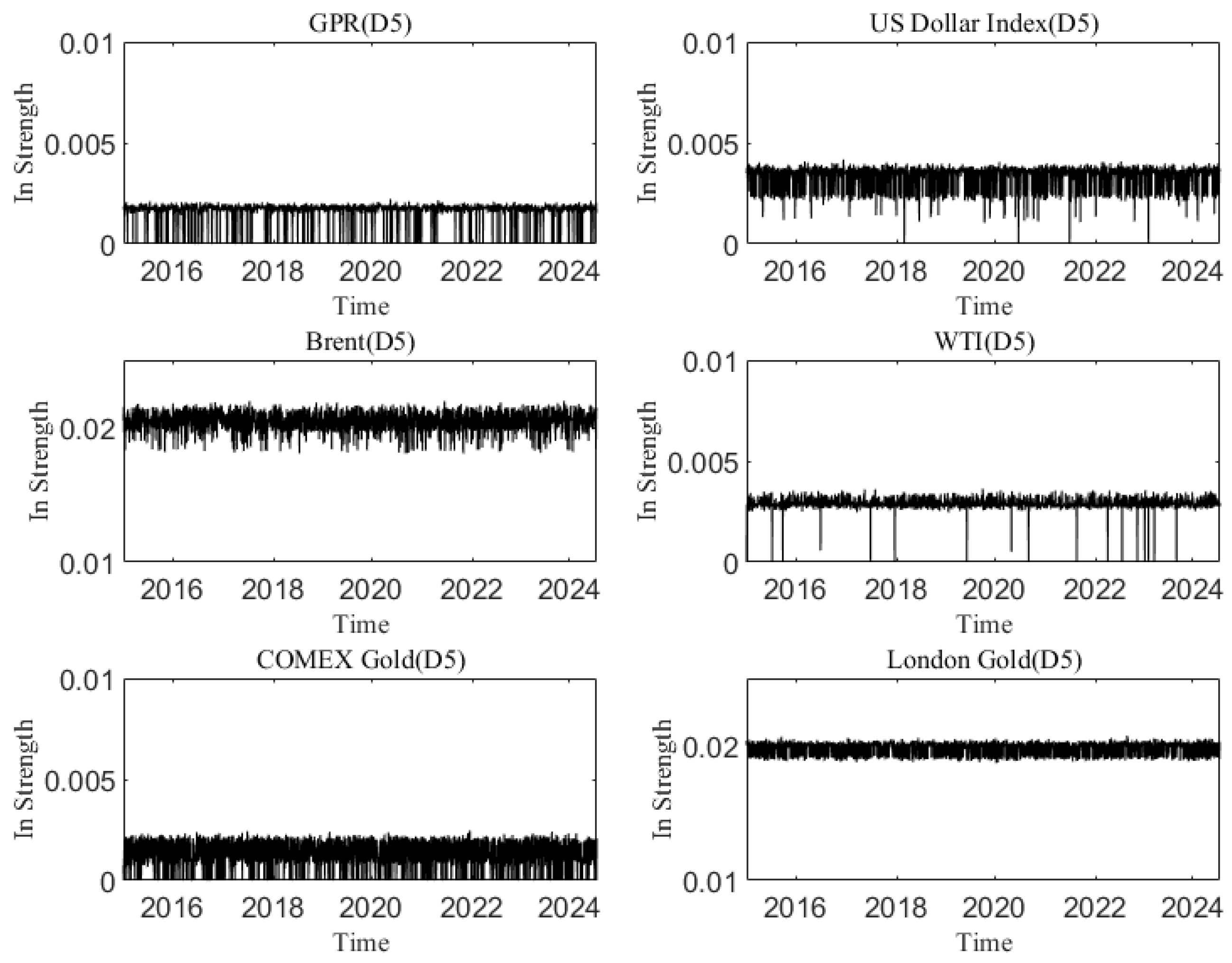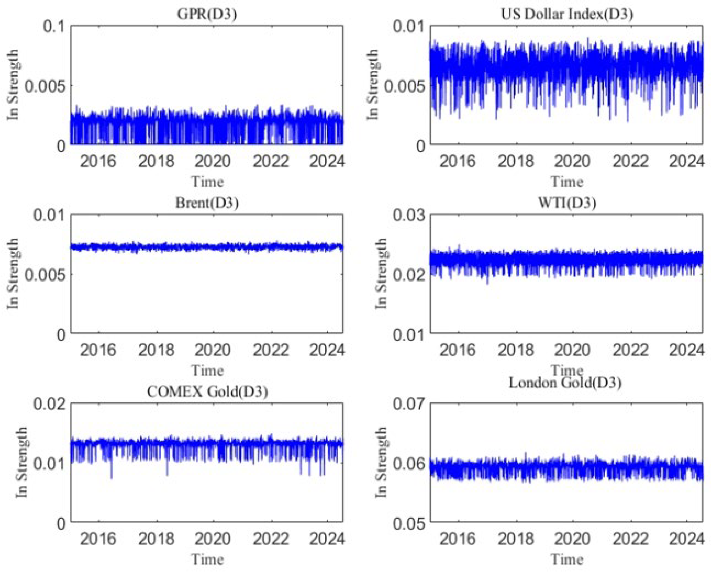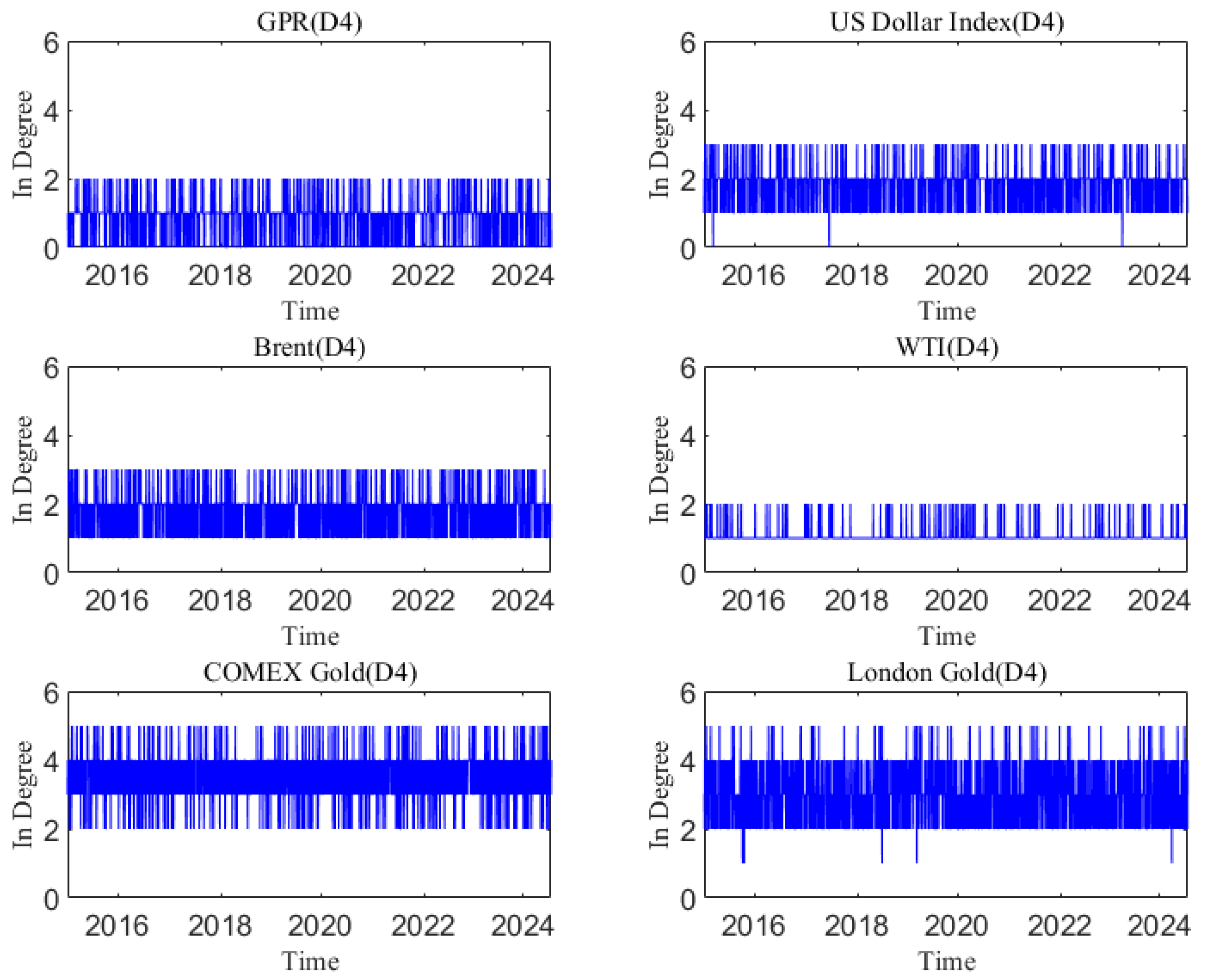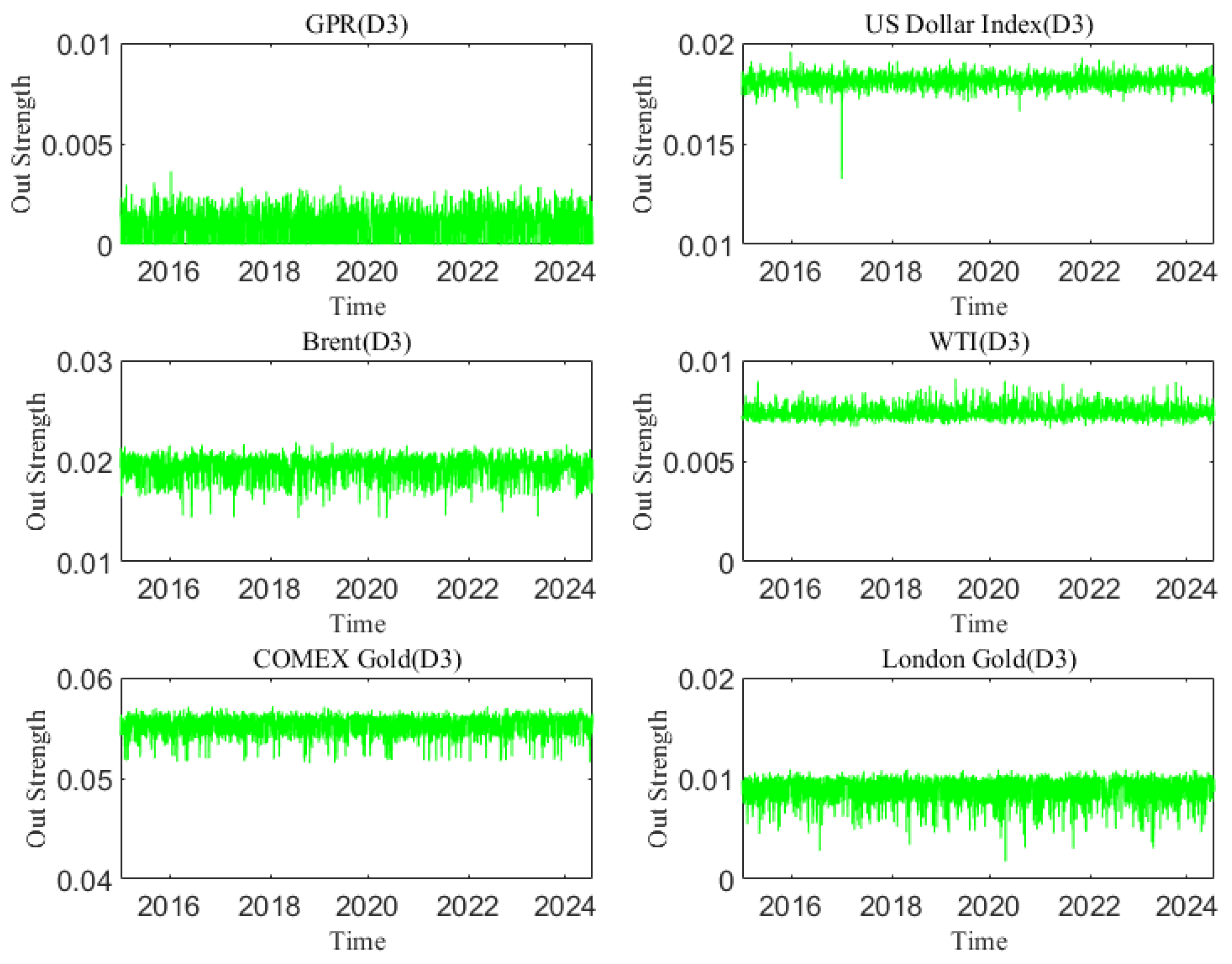 Appendix D to understand the dynamic in strength of each variable at other time scales. The results indicate that the in strength of geopolitical risk, the US dollar, and the price of crude oil and gold receiving causal information from others is time-varying. The dynamic characteristics of the in strength at different time scales are different, reflecting that the causal information inflow characteristics are related to the time scale.