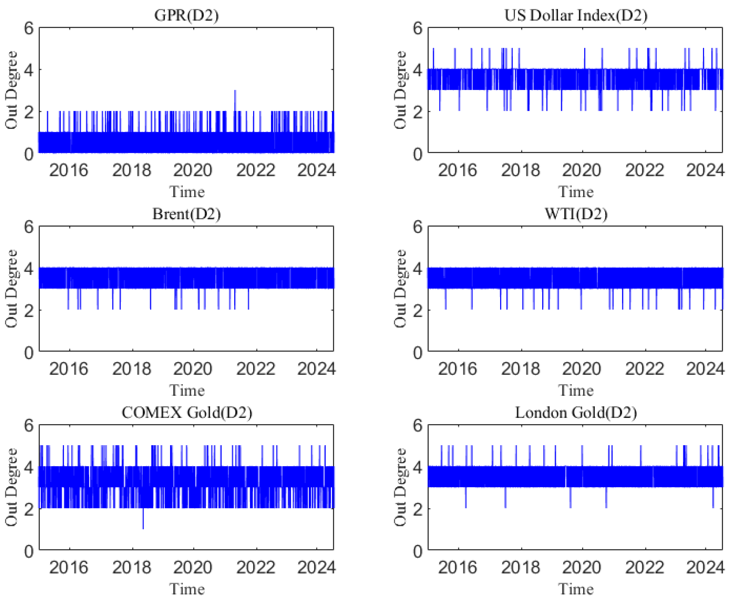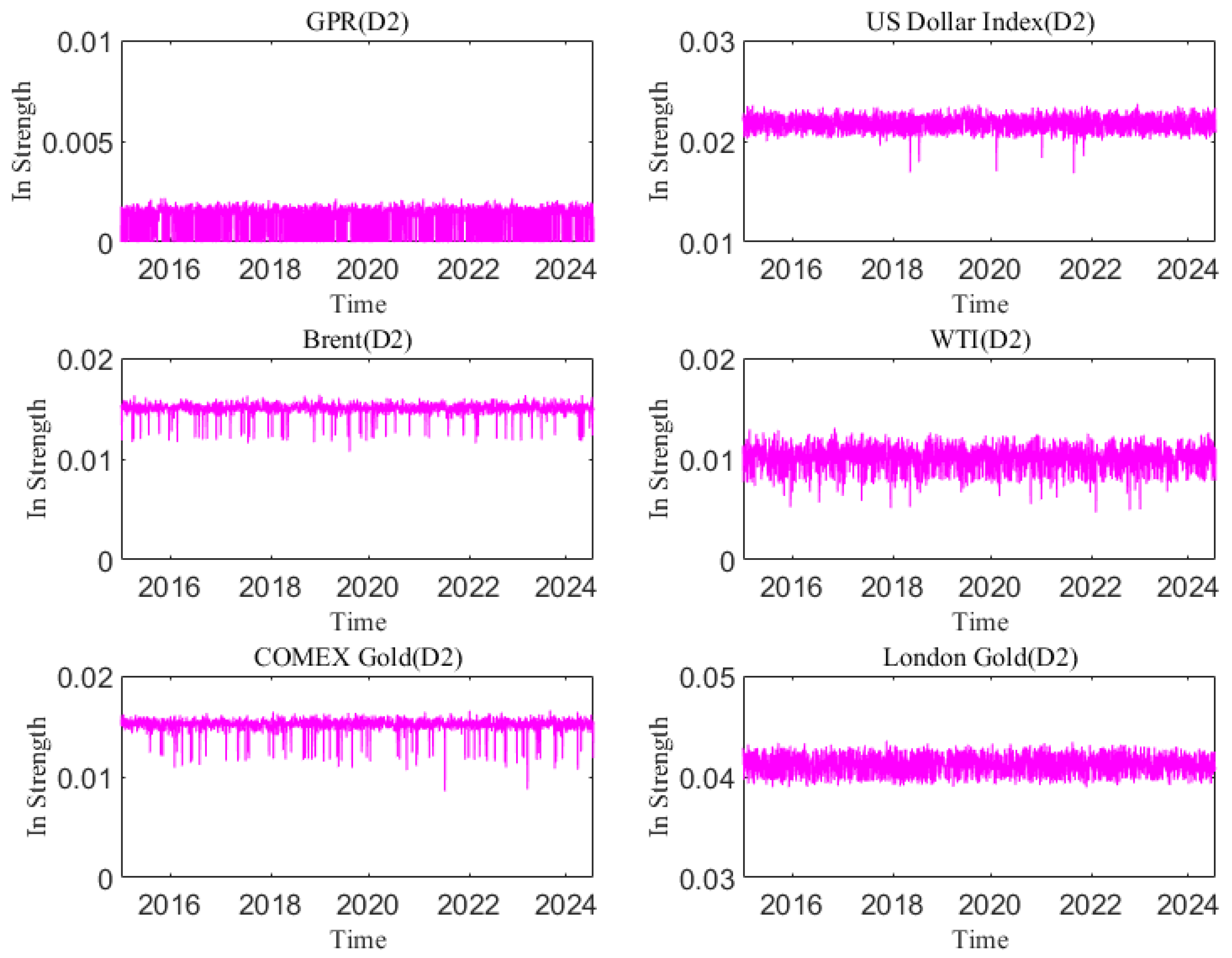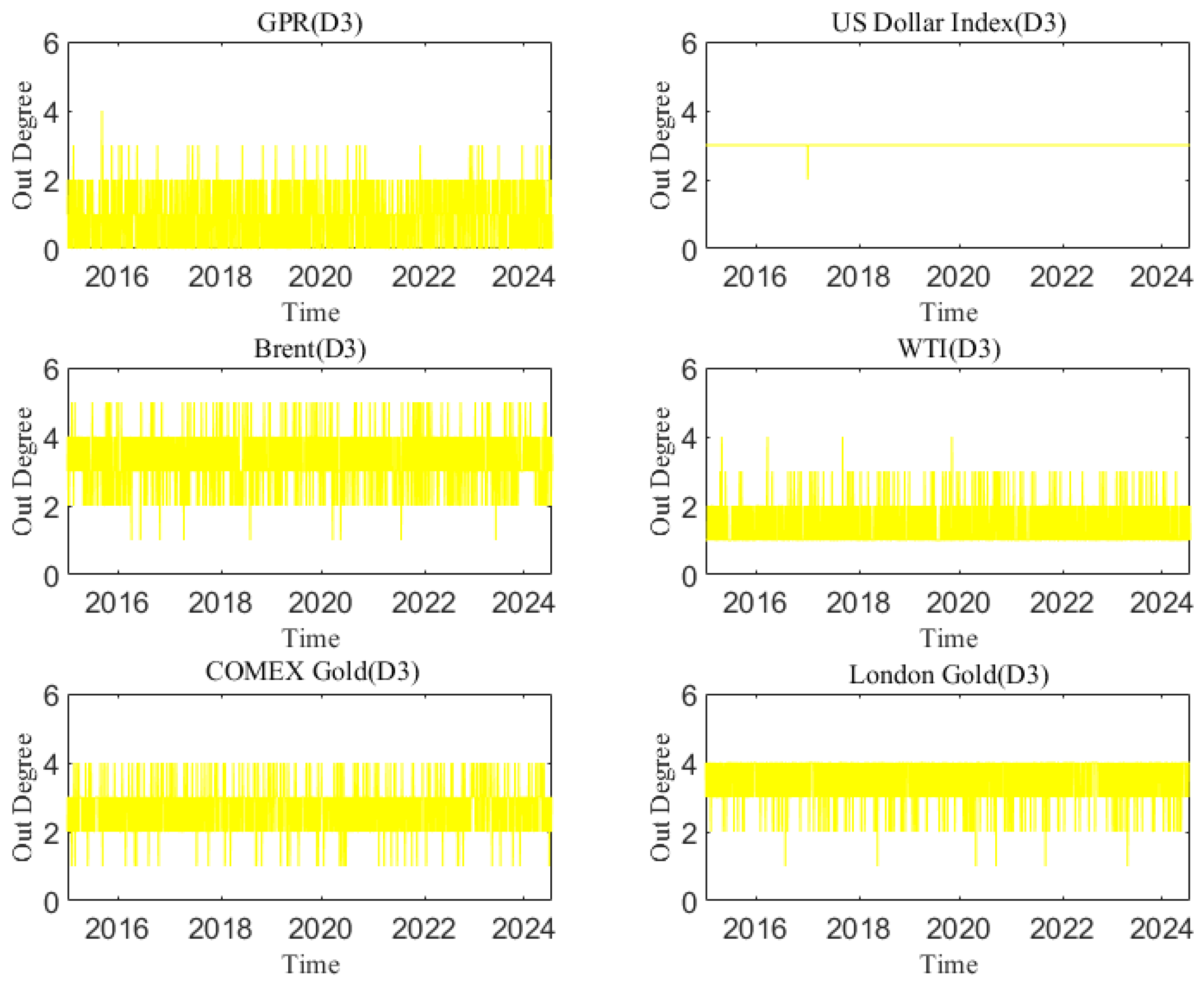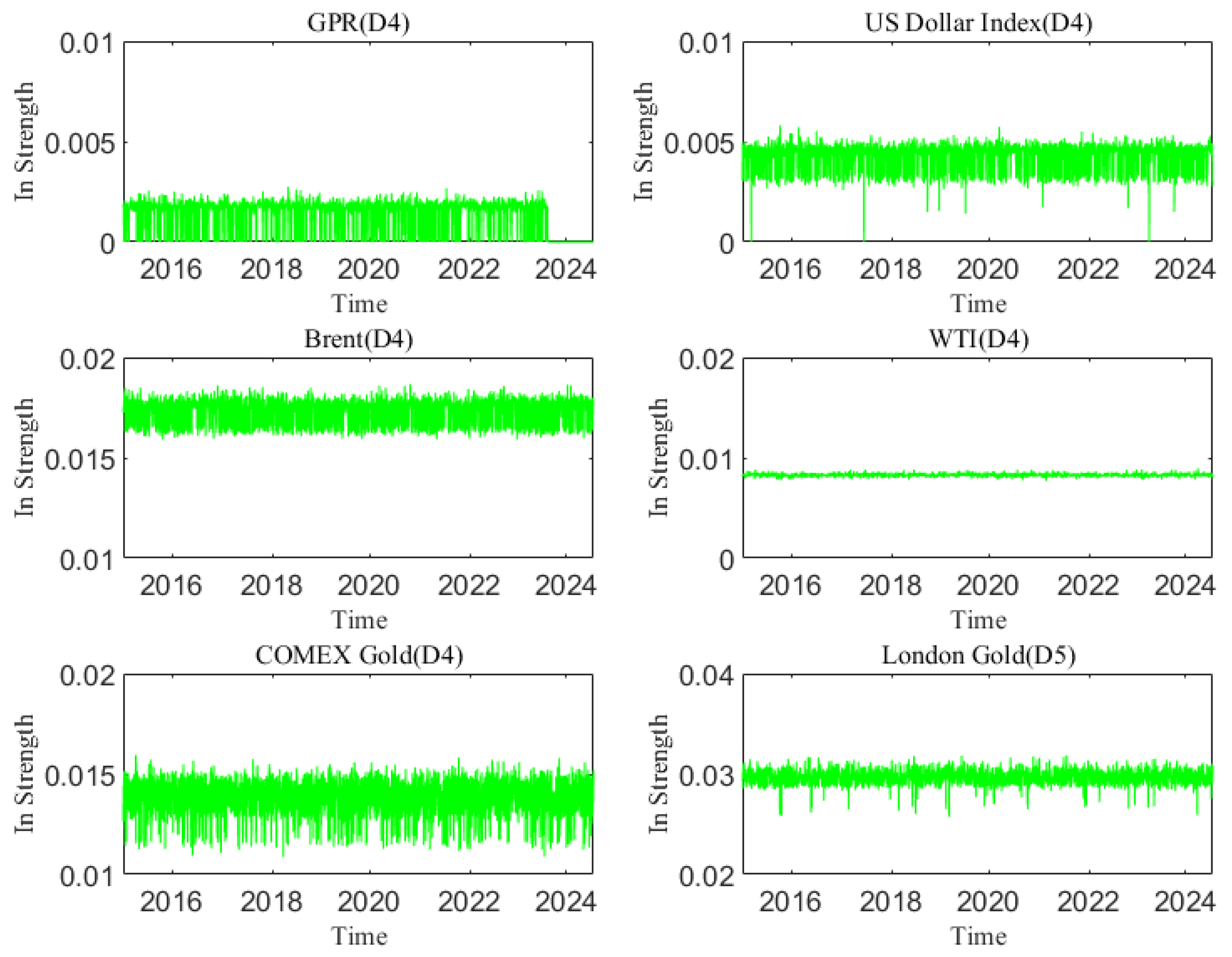 Appendix D to understand the dynamic in strength of each variable at other time scales. The results indicate that the in strength of geopolitical risk, the US dollar, and the price of crude oil and gold receiving causal information from others is time-varying. The dynamic characteristics of the in strength at different time scales are different, reflecting that the causal information inflow characteristics are related to the time scale.