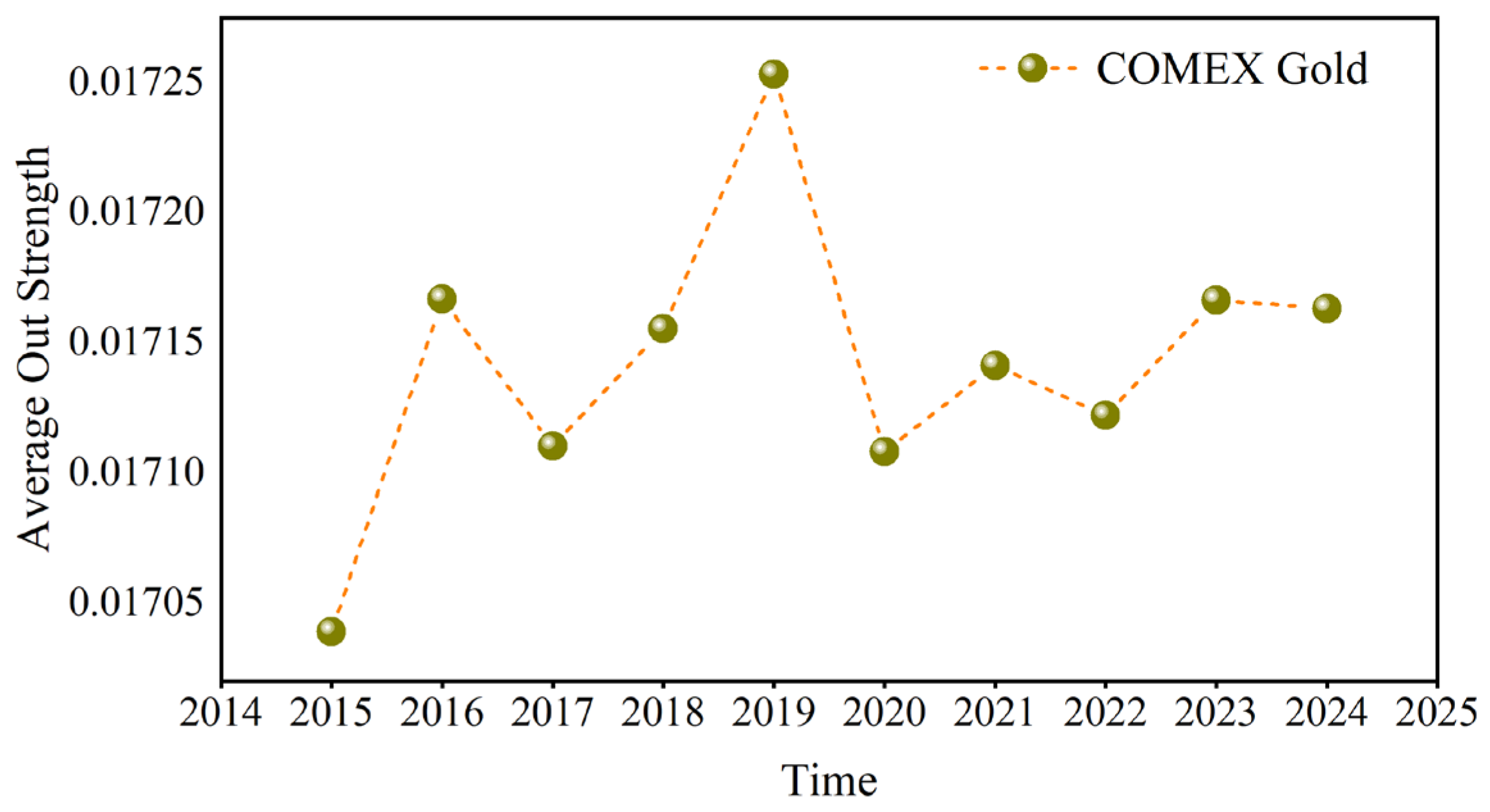 Figure 15 reveal that the influence of gold weakened in 2016. In 2019, the out strength and in strength of gold reached its peak, and then fell back to a stable level. In 2023, it showed an upward trend and then declined. The above analysis shows that when the local political risk increases, the influence of gold as a hedging tool in the causal information network increases, and the investment hedging effect on the crude oil market is more obvious.