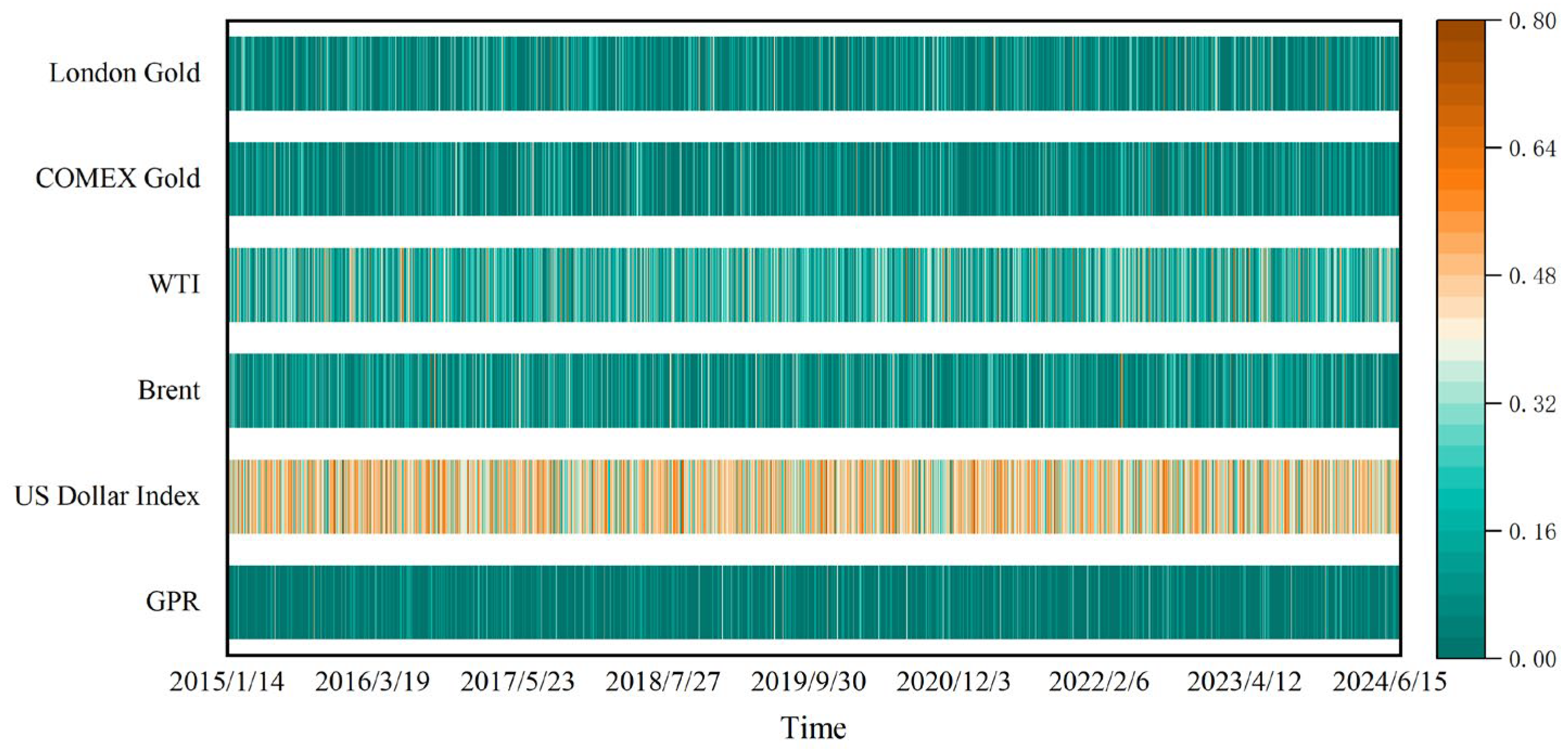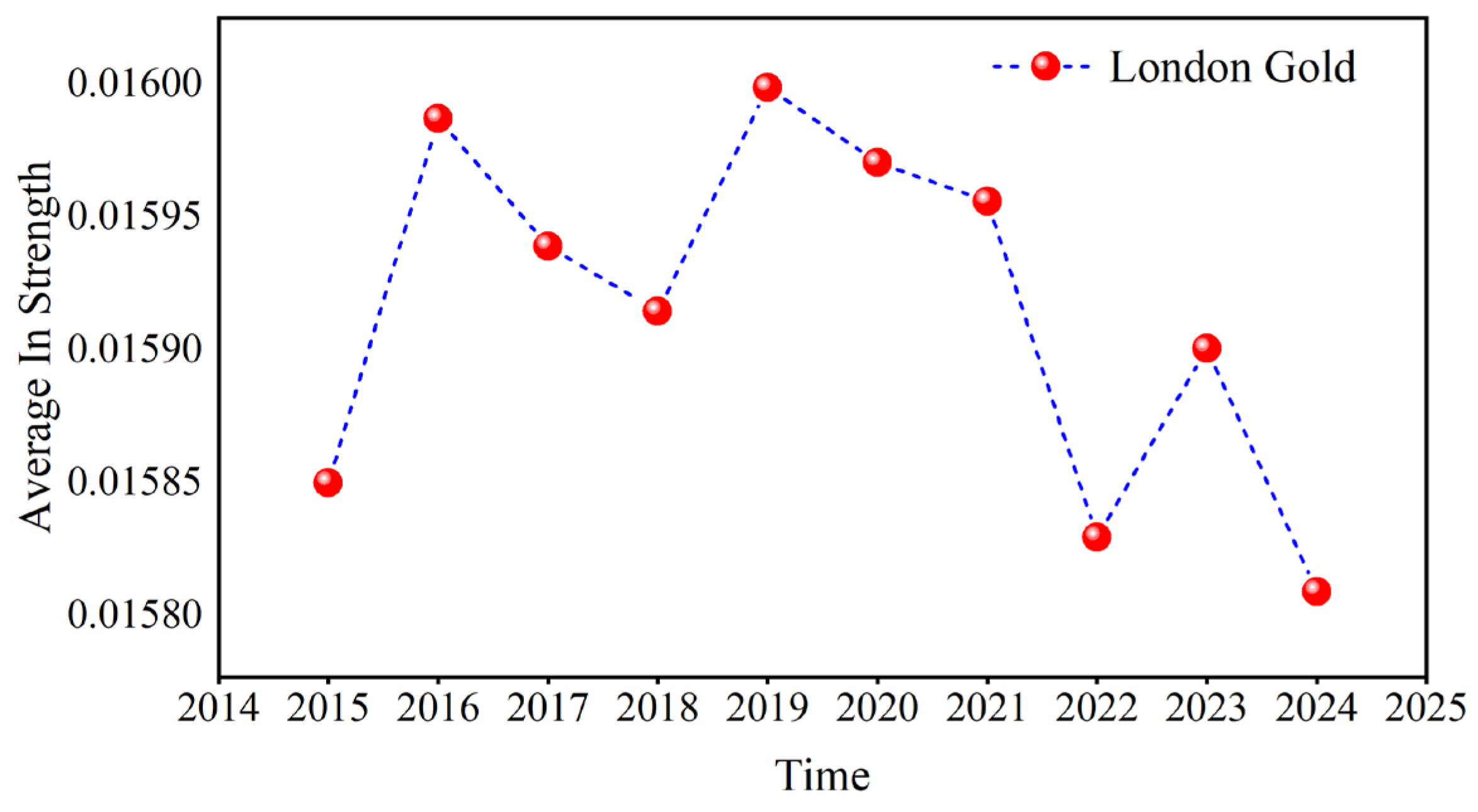 Russia’s annexation of Crimea in early 2014 triggered the crisis in Ukraine. This led to Western sanctions against Russia, which raised geopolitical risks. Concurrently, from 2014 to 2015, the Syrian civil war continued to intensify, attracting the participation of many countries and regions, such as Russia, the United States, and Saudi Arabia. The Middle East continues to face geopolitical tensions because of multiple conflicts, such as the ISIS threat in Iraq and the negotiation of the Iran nuclear deal. Market participants typically react to events such as geopolitical tensions, sanctions, and supply disruptions, resulting in volatility in crude oil prices, thereby enhancing the hedging effect of gold on the crude oil market and highlighting the dominance of gold. This is reflected in the sharp increase in the out strength and in strength of gold during 2015.