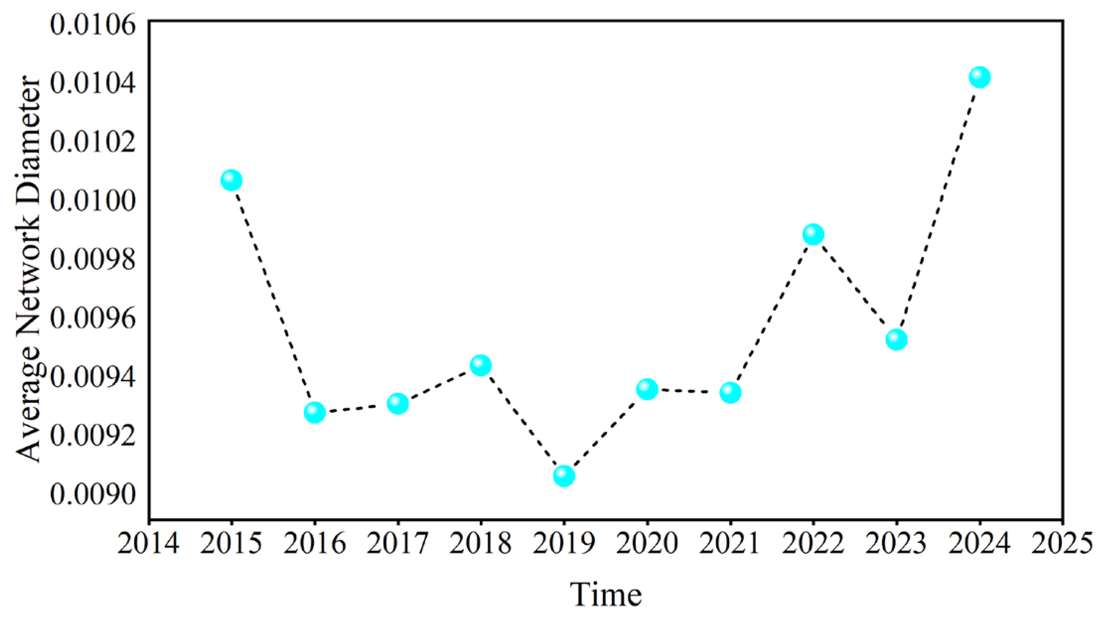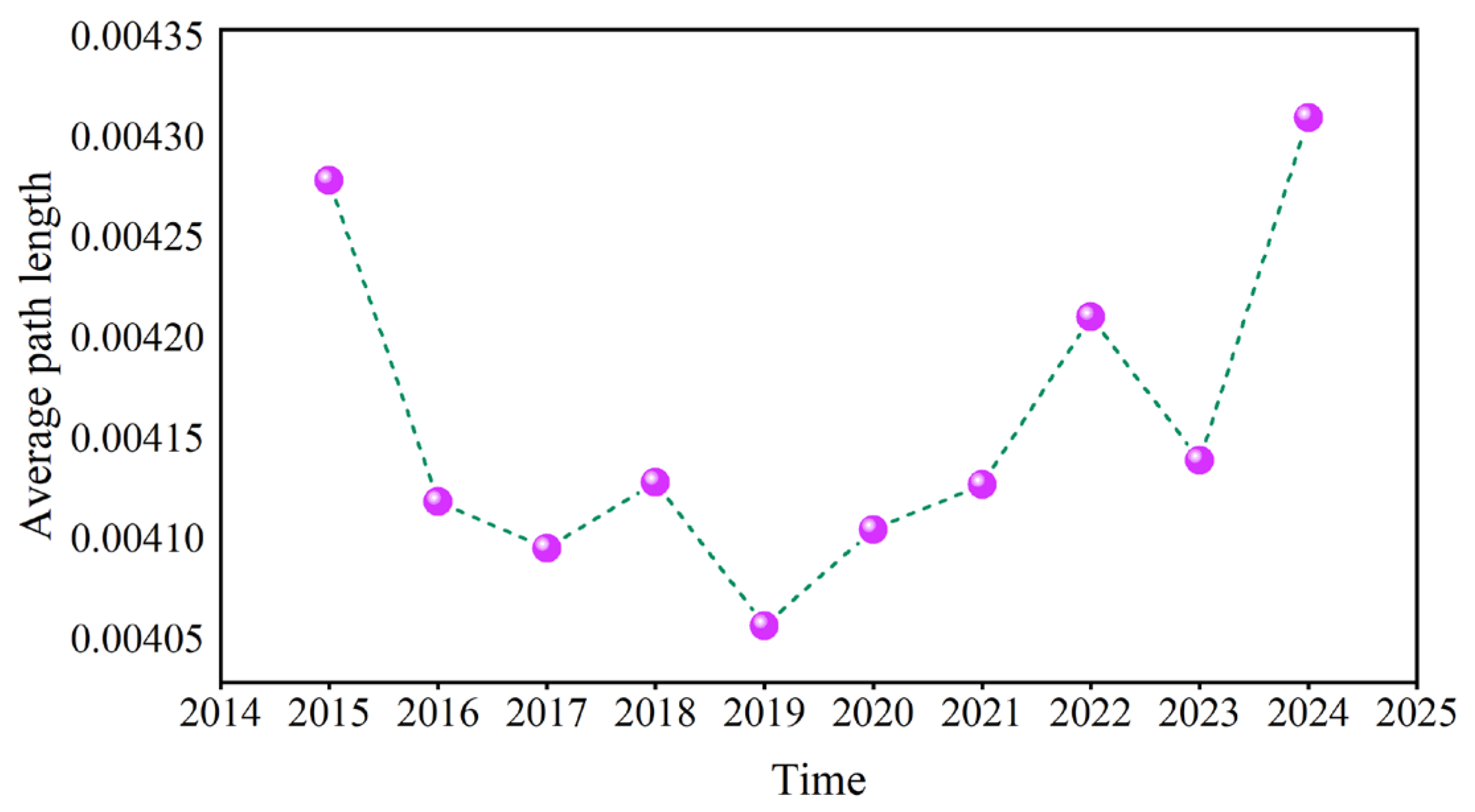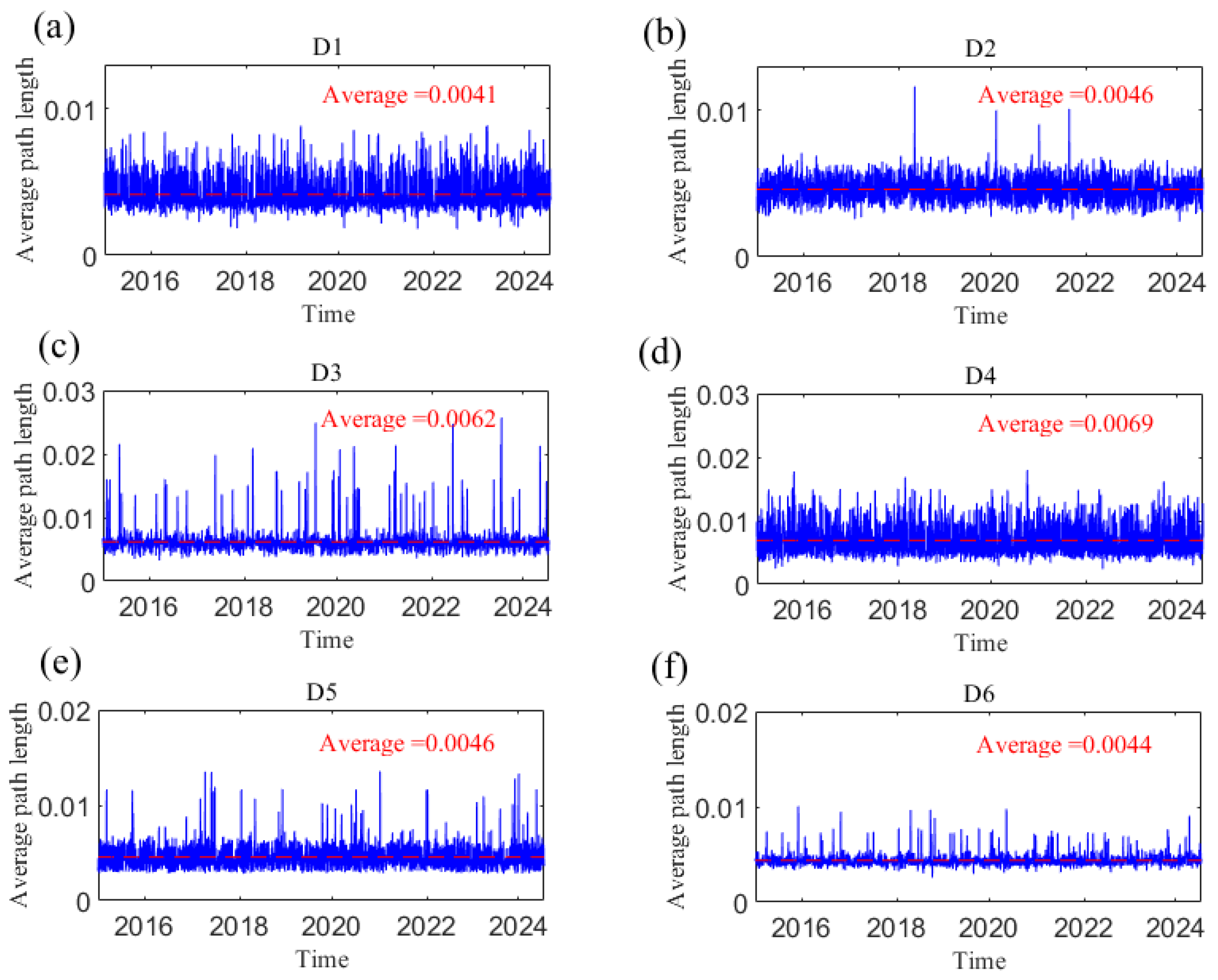 Second, the structural characteristics of the causal information network system are analyzed. The results show that with as the time scale increases, the transmission speed of causality among variables becomes slower, and the network becomes more stable. At the short scale (D1), the transmission speed slowed during the Russian–Ukrainian conflict and the Israel–Hamas conflict. When an emergency occurs, the change trends of the average path and network diameter at different time scales can be found. For example, at the scale of 4–8 days, when the Chinese stock market crash and the outbreak of the COVID-19 pandemic occurred, they showed a significant rise. Systematic risk at the short scale is greater than systematic risk at the long scale; since the China–US trade war in 2018, systematic risk has continued to increase annually.