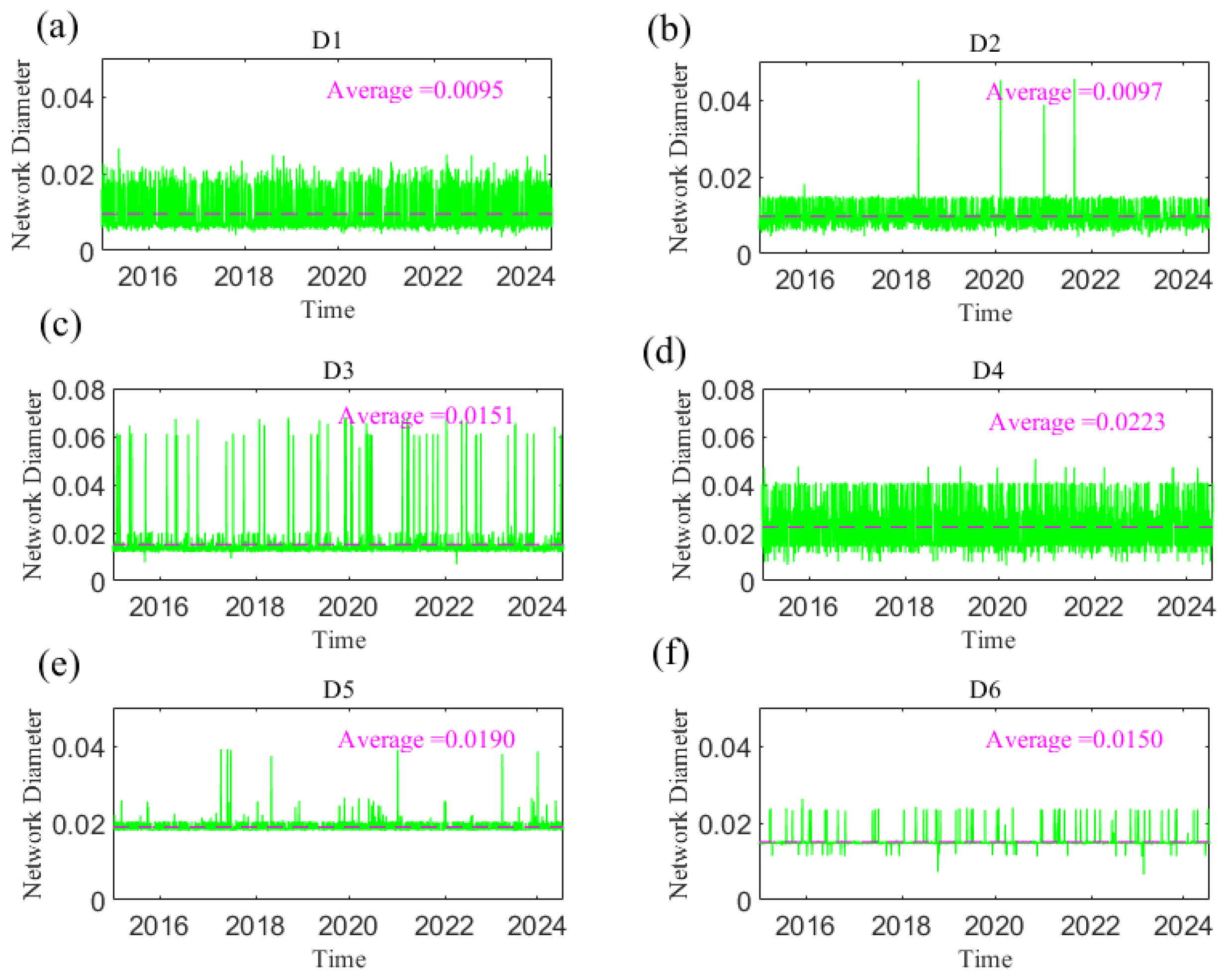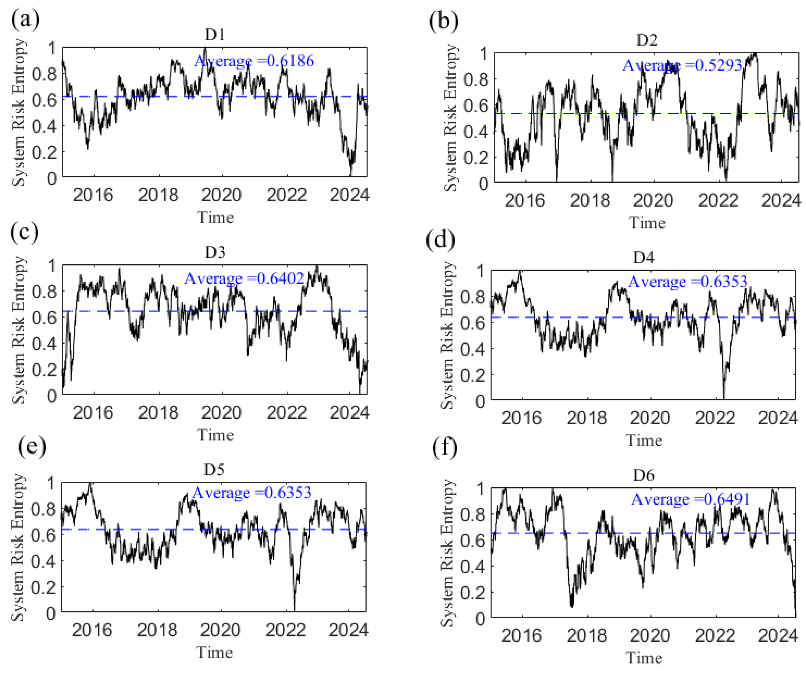 Figure 24 shows the system risk entropy of the network at short, medium, and long scales. The larger the system risk entropy, the smaller the systematic risk. The network systematic risk is time-varying. Taking D1 as an example, the system risk entropy began to decline continuously from above the average value. After the Chinese stock market crisis in 2015 and the COVID-19 pandemic at the end of 2019, the local minimum value appeared, then rose gradually and fluctuated around the average level until the end of 2023 when the systematic risk reached the maximum, which was most likely due to the Israel–Hamas conflict. Additionally, from the overall trend of change, the short-scale (D1 and D2) network system risk entropy is the smallest, the medium-scale (D3 and D4) is higher, and the long-scale (D5 and D6) is the highest; that is, the average value of the short-scale network risk entropy is less than that of the long-scale network risk entropy. This finding indicates that systematic risk tends to decrease as the time scale increases.