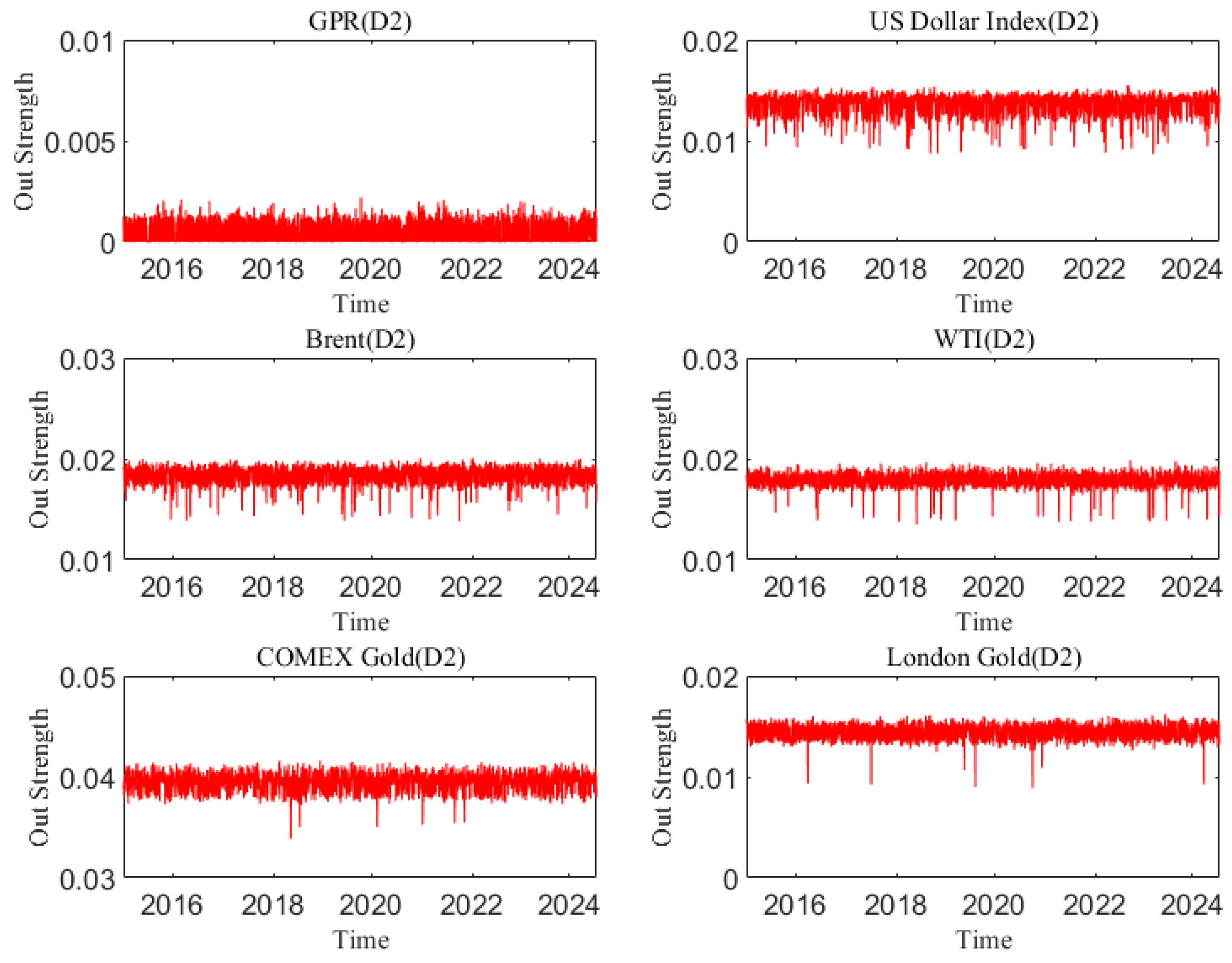 In the analysis of this paper, the out strength measures the strength of a variable’s influence on other variables. The dynamic causal out strength of each variable at the D1 scale is shown in