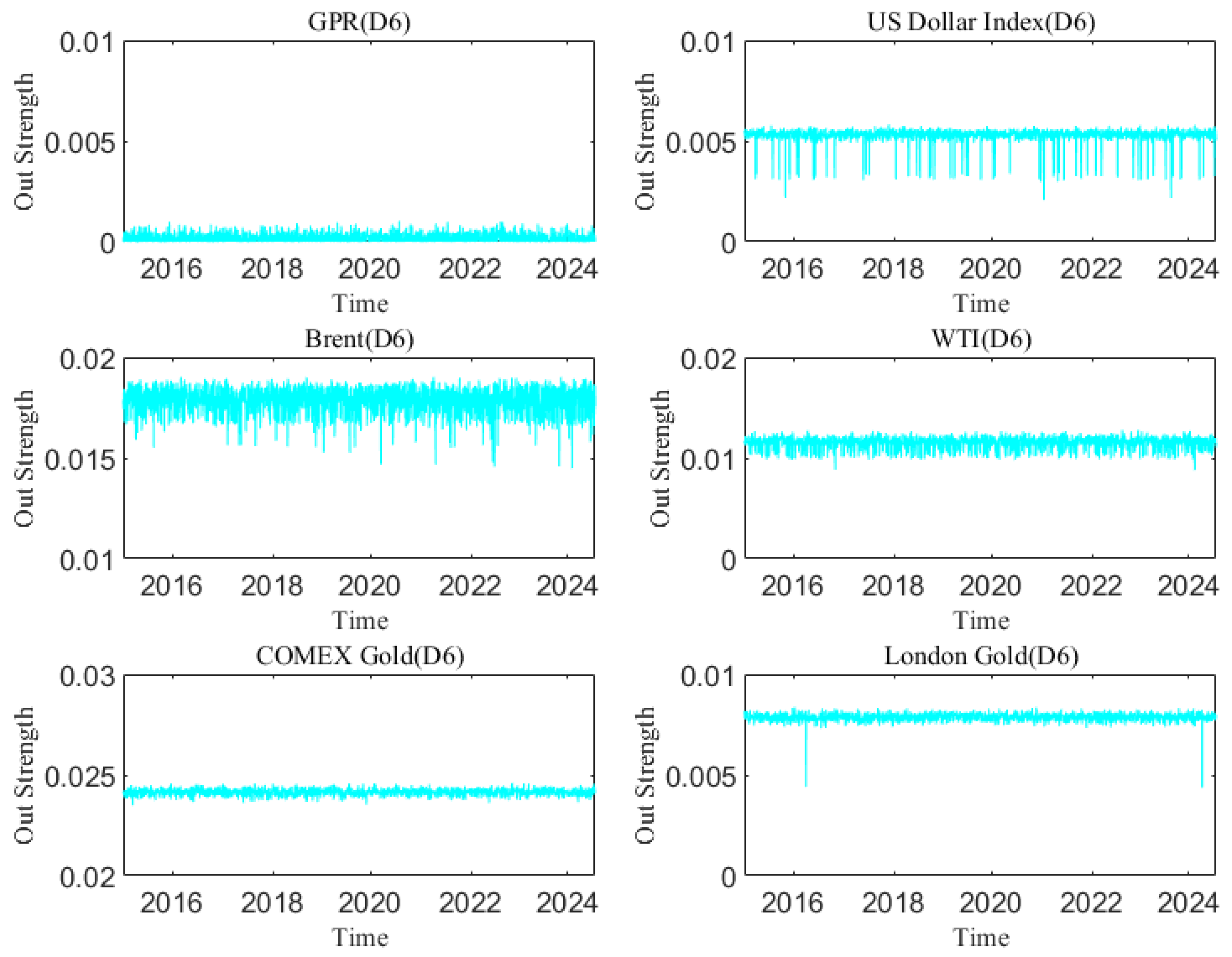 Figure 11 shows the average out strength of the six variables at the D1–D6 scales. For example, COMEX gold has the largest value at the D1 scale and has the greatest influence on other variables in the past ten years. The out strength of geopolitical risk is the smallest at scale D1. The results show that gold is the most important causal information transmitter.